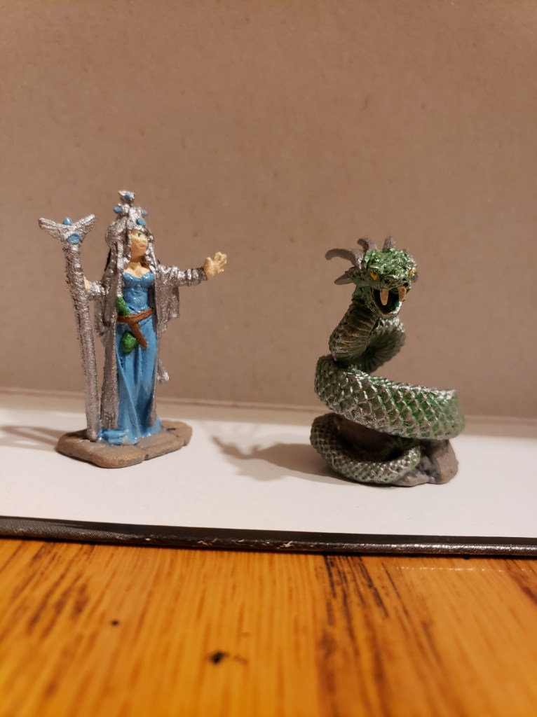 From Wick’s perspective, he moved through the storm blindly and eventually found himself in the presence of a mysterious woman. She was tall and dressed in the robes of a cleric. He looked past her and saw an enormous constrictor snake behind the woman. That was when he noticed the faint green scaling on her face and hands. He was afraid at first, not wanting the snake to eat him. They introduced themselves and that was how Kariss the Yuan-ti Pureblood Cleric of Bahamut joined the party. Kariss was beautiful and Wick was a sucker for hot ladies. She got annoyed at his obstinance at riding her snake to make their trip faster and at his lechery.