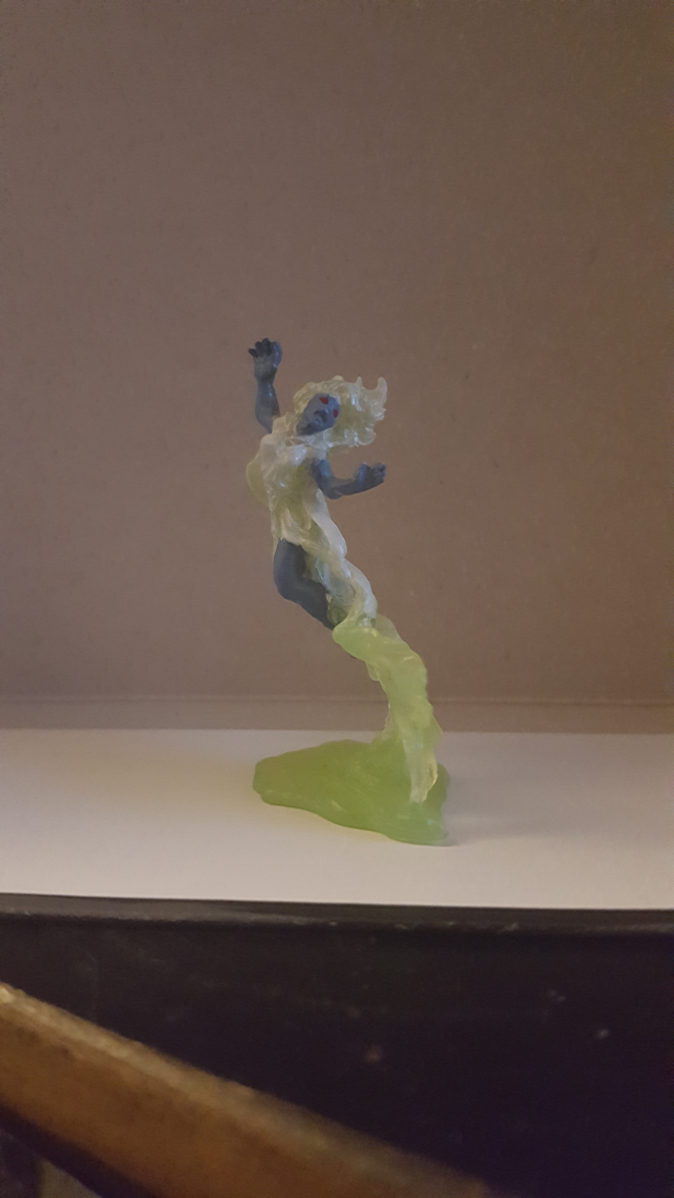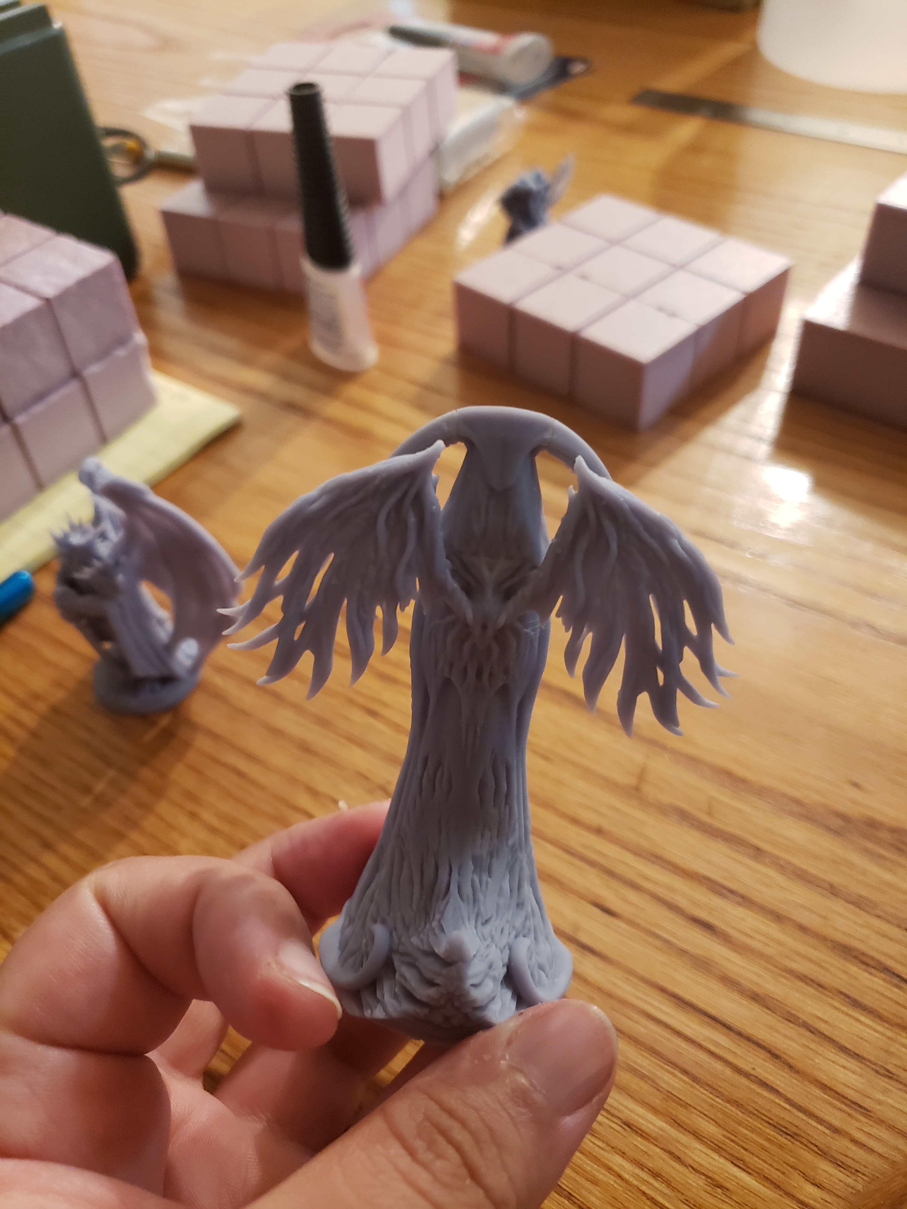 The miniature above was more of a repair job than customization but it did help me learn that sometimes you can still have viable characters from damaged miniatures. I would recommend making sure your printer is a reputable one so you minimize the chances of receiving damaged miniatures. For this one I had to think on my feet. I didn’t have green stuff of professional filler of any kind so I used spackling. Yup, simple spackling. Once the hole was filled, i primed the mini and got to work painting it. My own husband has trouble finding where the hole used to be now.