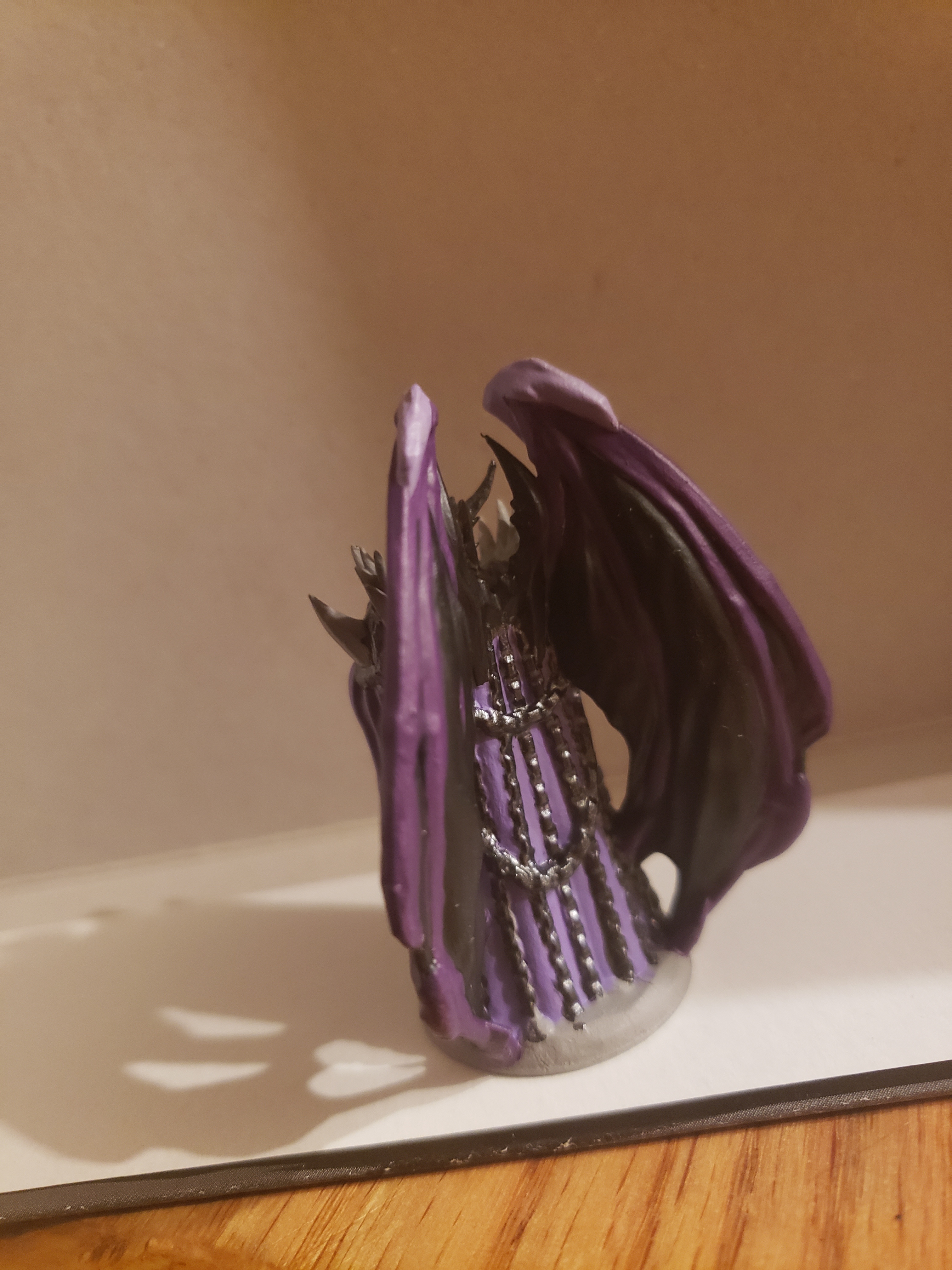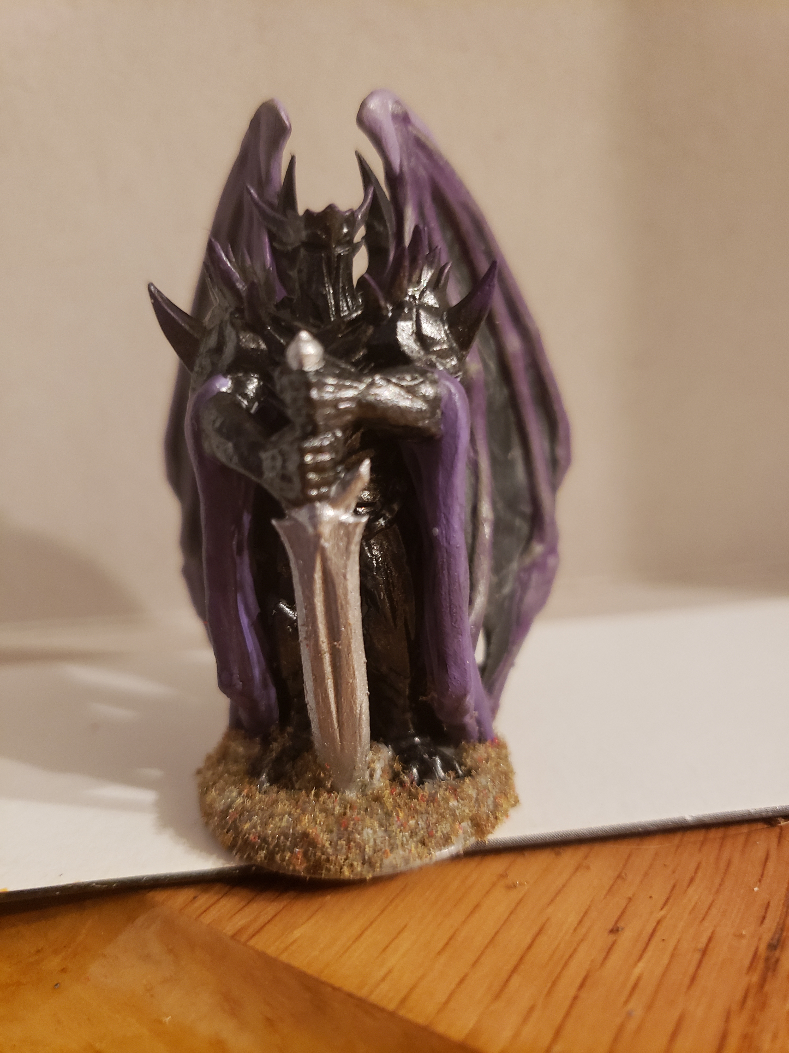 This beautiful lady above is the Queen of Mirrors. The miniature was a custom printed one we bought online so it already had pretty unique features. After prime and paint, I added a simple dirt base but also added shards of glass, as if from a broken mirror, to act as the physical representation of her mirror shield. The mirror shield is a whirling dervish of mirror shards that whirl around her, protecting her from magic and doing damage to anyone who gets too close. Addding this small enhancement gave the table members more visual context of who this villain was. She was truly terrifying to fight.