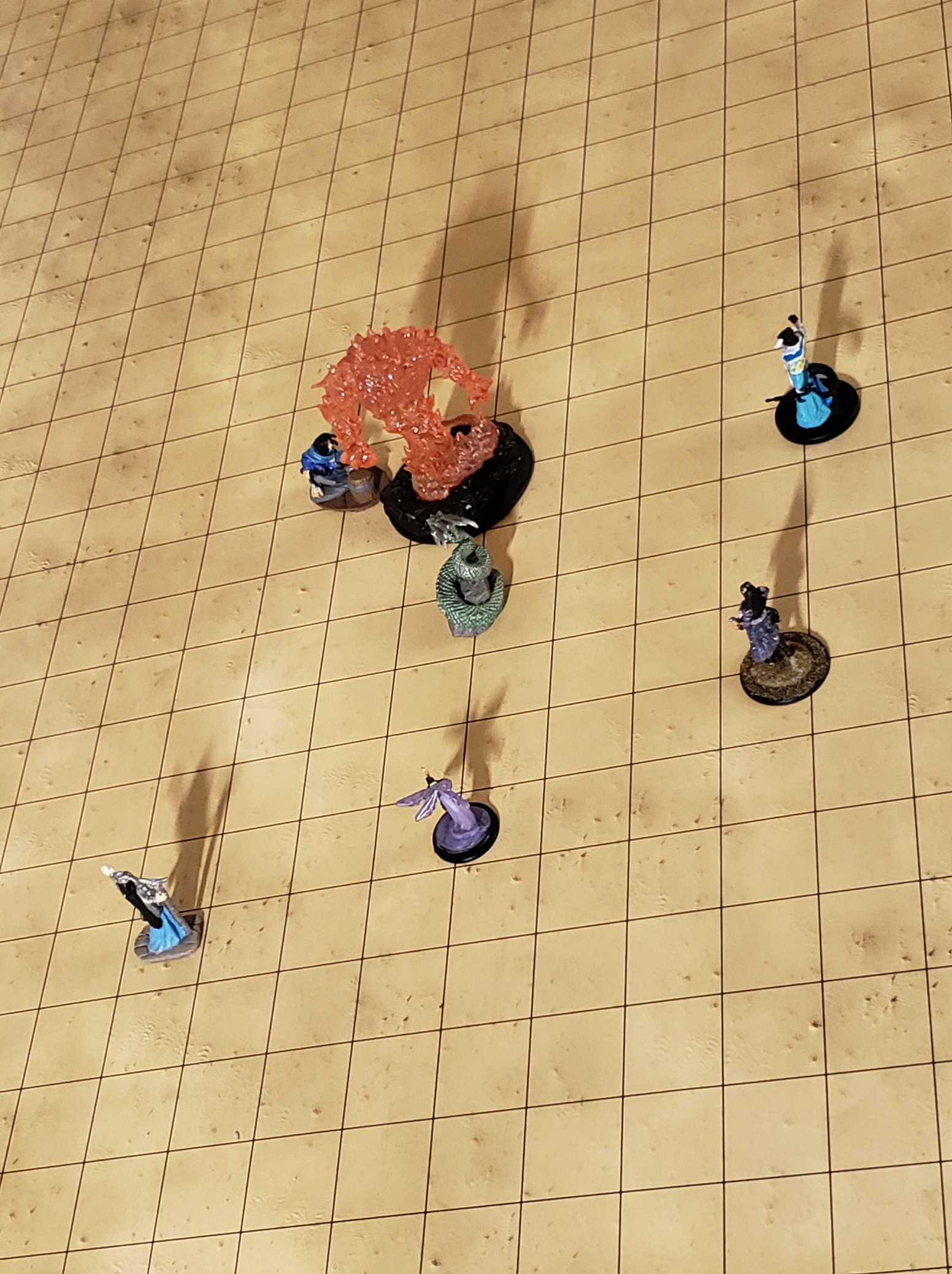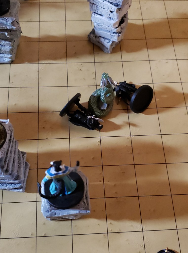 Just ahead of them, a giant lava worm burst out of the ground. It had a round maw full of rows on rows of razor sharp teeth. A low red glow shone out from within. The sand around it was transformed into glass as the heat from the worm permeated the sand. It attacked and the two ladies on brooms were knocked off. They were about to smack into the ground when Milo intervened with a quick Feather Fall spell. They landed with a gentle puff on the sand. Kaladrax was keeping it at bay with spells while the ladies recovered. Milo was trying to get in to make attacks but, every time he hit, the lava would pour out of the wound and splash him. He was taking as much damage as he was giving.