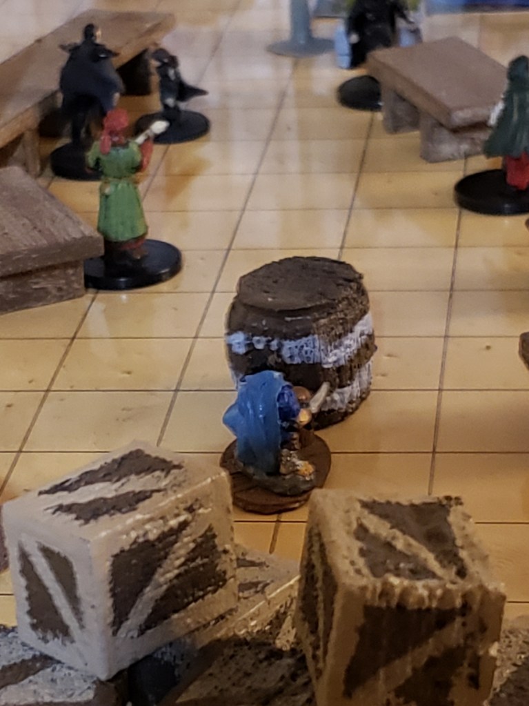 Wanting to get a better view, Aleera turned herself into a shadowy raven that blended with the deepening twilight. She flew closer to the party and scouted them out, looking for the person she had to fight. Meanwhile, Milo simply walked up to the party and hid in an empty barrel. His small size and rogue abilities made it impossible for anyone to spot him.