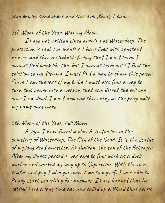 As per dragonborn custom, all assets shall hereafter be transfered to my only son and heir, Kaladrax. To my loving wife, I know Kaladrax will take care of you and make sure you are always safe. I love you always, in this world and the next. To my son, Kaladrax, I ask that you make your mother’s life as comfortable as possible. The greenhouse is her favorite sanctuary as you know, please ensure that it is always ready for her. I did the things I did because I love you and cannot bear for you to make the same mistakes I have. I hope this journal I have left for you can shed more light on my reasons. Besides the assets and home you have now inherited, I also bequeath you with this Ring of the Umbral Ambassador and this pocket watch that belonged to my family. Anything else enclosed within is also yours now. May these things bring you more success than they brought me. I love you all, my family, my brood, my life.