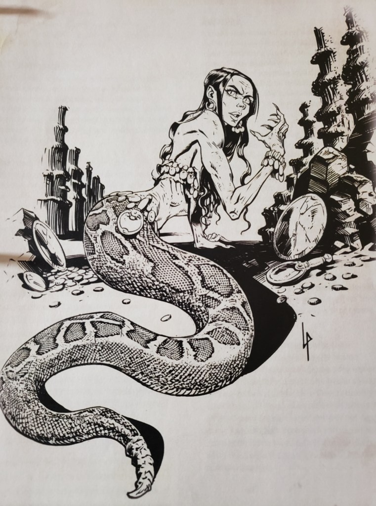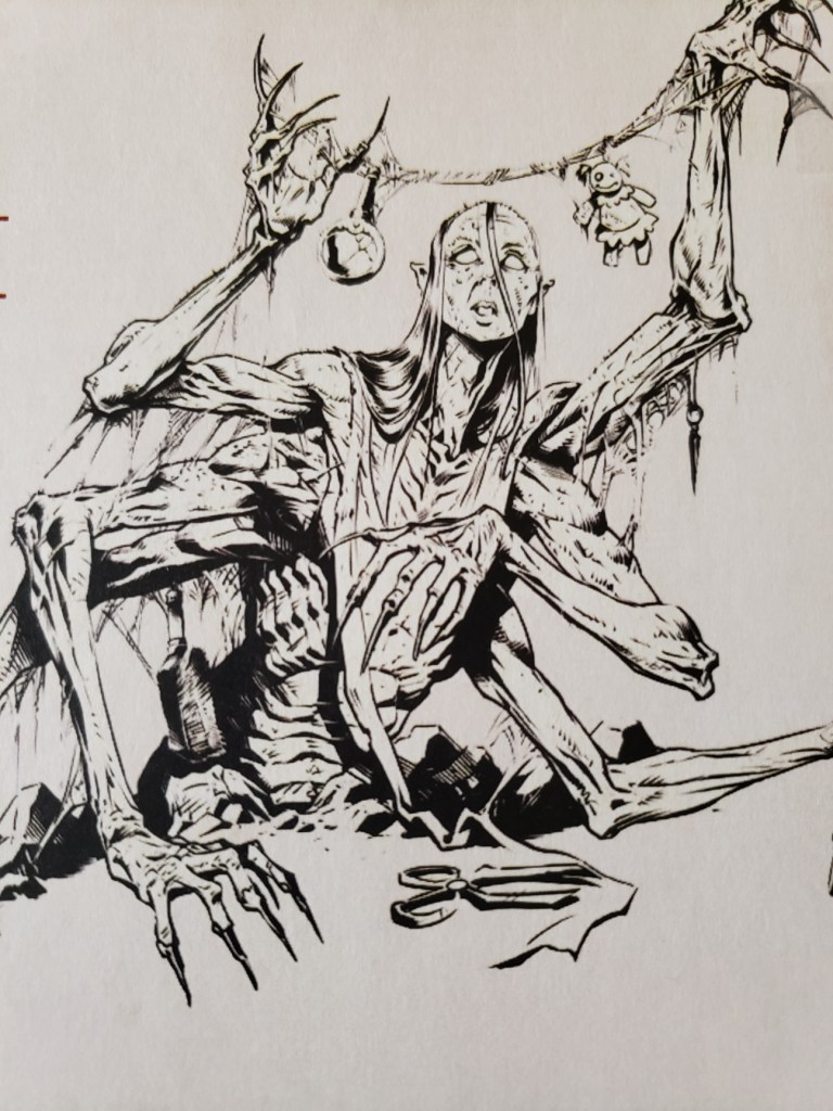 There, at the end of the corridor, was a room even more full of cobwebs. In the center was a giant spider woman. She was frightening at first but the party relaxed when they realized she wasn’t attacking, only looking at them with a sort of melancholy stare. They tried talking to her but all she could say was,