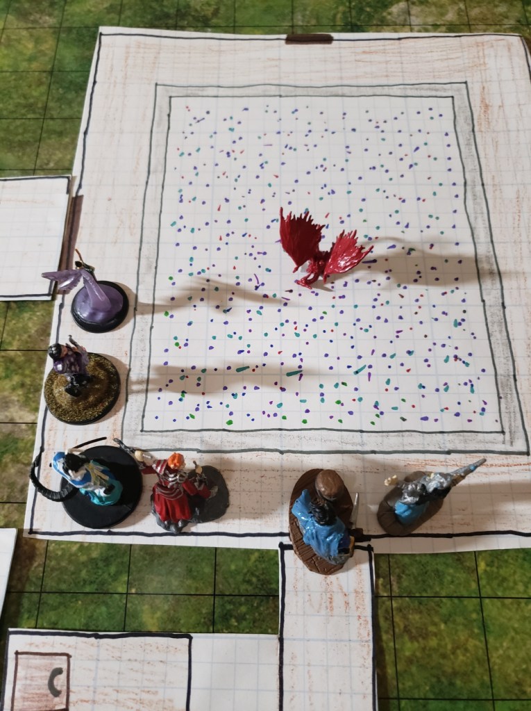 They moved on and found a small red dragon. They thought he was a pseudodragon but found out that he was an adult red dragon that had a growth issue and never grew past wyrmling size. He called himself Greystack the Terrible and told them they had to free him or else. The party laughed and after looking around a bit they found a ball pit. The balls were explosive and they dropped the adult red dragon, as he was shouting expletives the entire time. As soon as he made contact with the balls, Karriss put a wall of force over the ball pit and they watched as the tiny red dragon was exploded into oblivion by tiny balls.