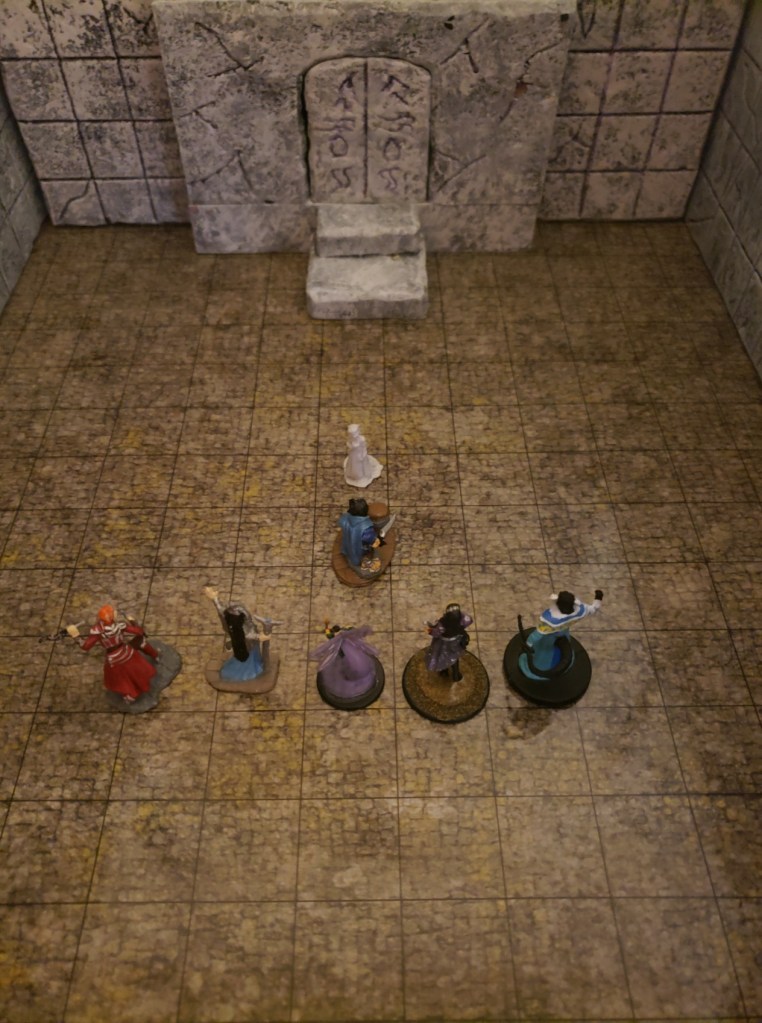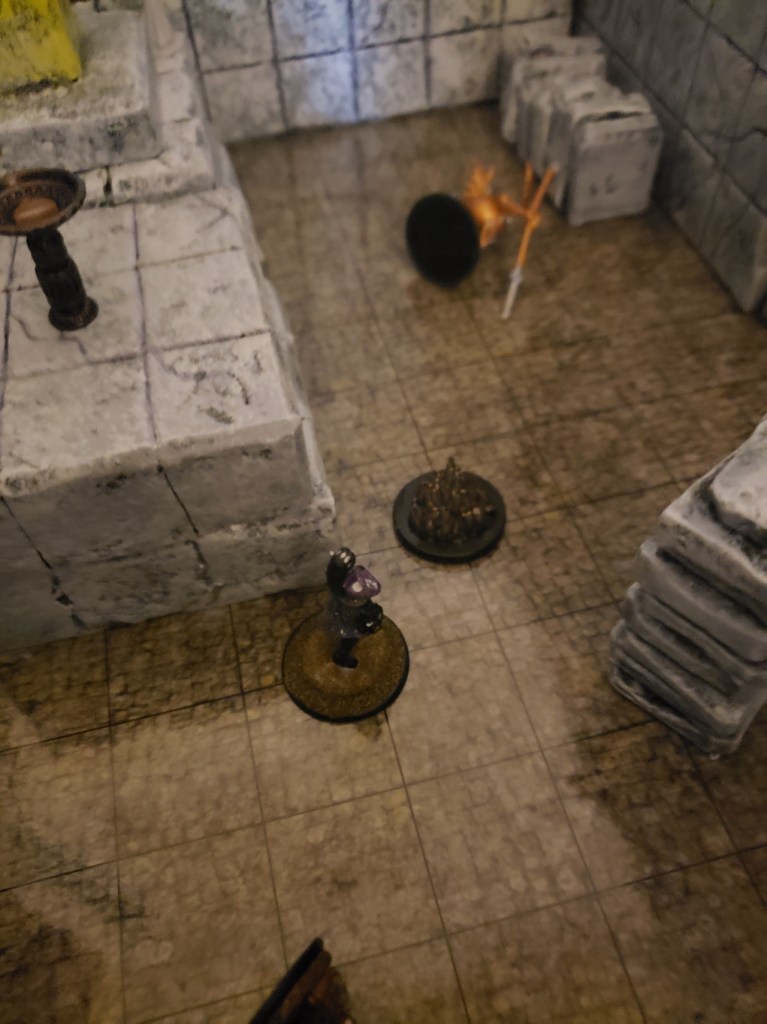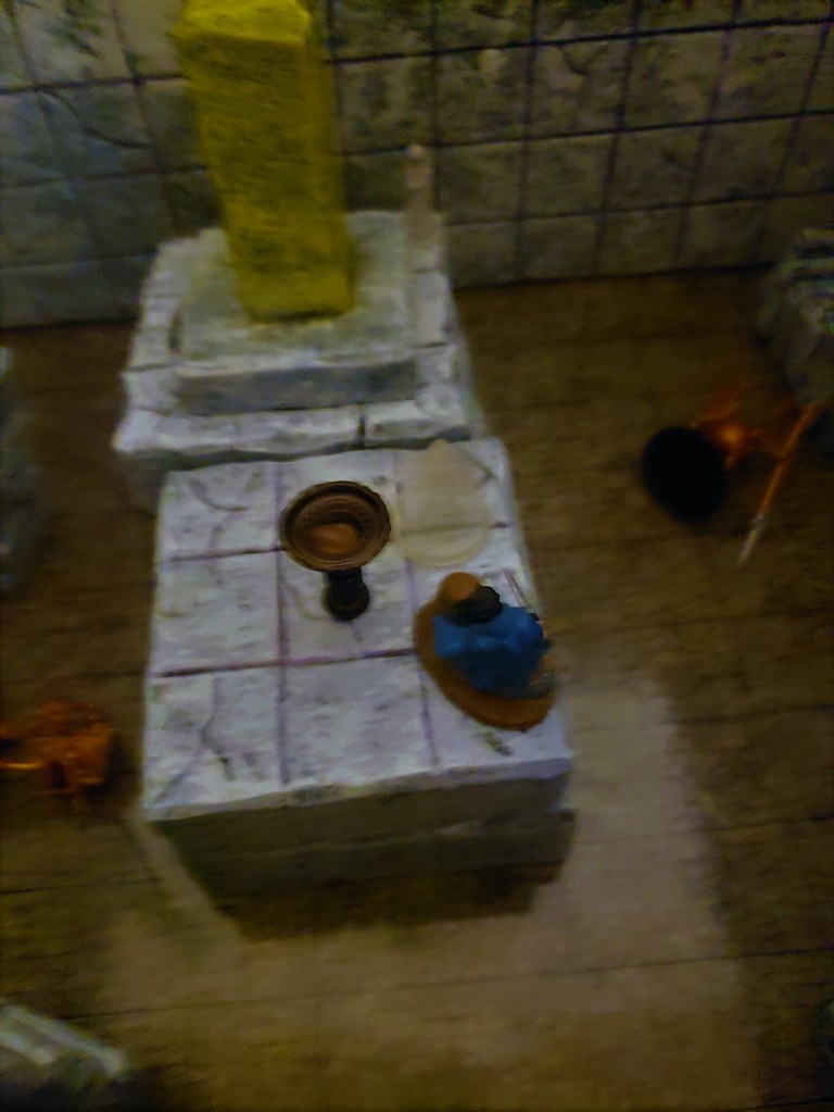 This time it took a sword from its side and made a stabbing motion forward. When the blade turned to it, it was coated in red at the tip. The statue then stabbed gently into the floor and held it there. Milo looked up in agony and whispered that he thought he needed to stab one of them to coat the blade in red. Hepolita stepped up, put a hand on his shoulder and told him this was the least she could do to help. He asked if she was sure and when she growled at him to get on with it he plunged a halfling sized sword into her arm to coat in her blood. With that done he gently stabbed it into the ground as the statue had done and waited.