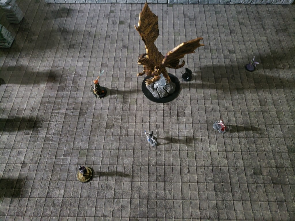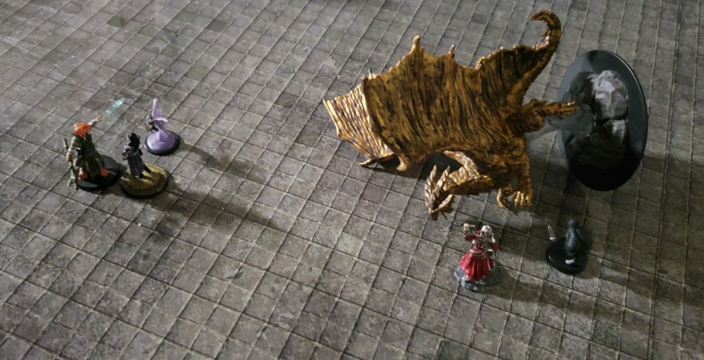 In the next moment it attacked. It lashed out with its claws, tail and mouth. The party split off in different directions to avoid getting hit by its large sweeping attacks. After many long minutes of battle they managed to take it down with their various magics and attacks. The true hero of this battle was Kaladrax. At the last moment he had activated his Ring of the Umbral Ambassador. This special family heirloom granted him the ability to gain access to shadowy abilities that made him stronger.