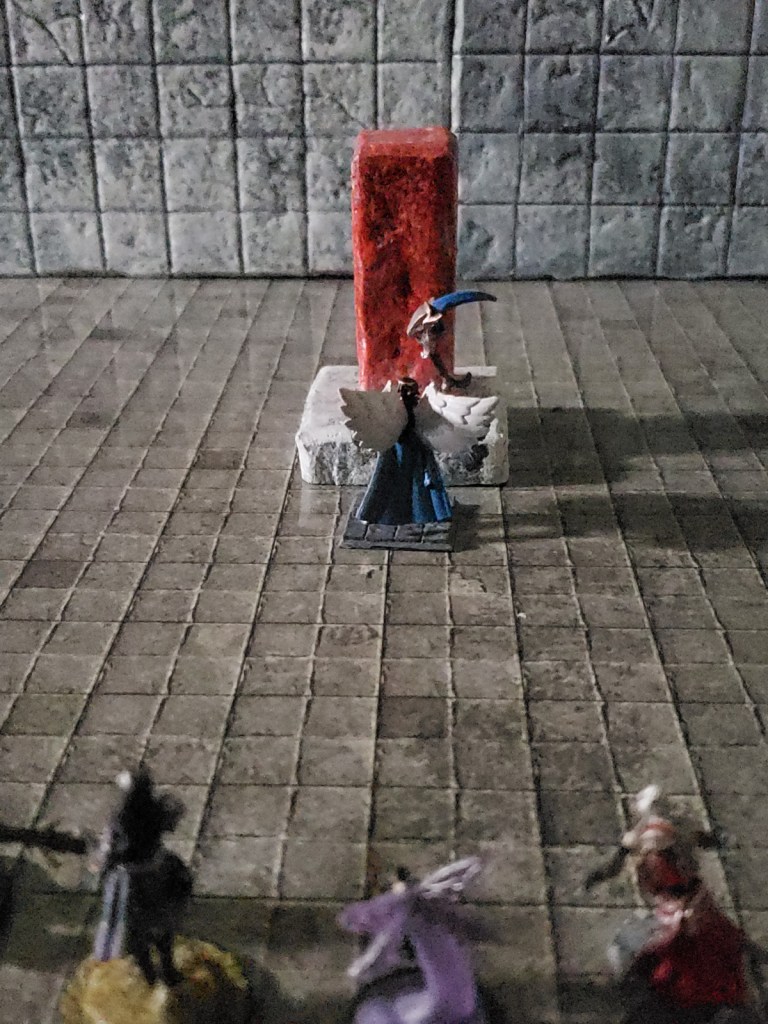 Kariss had gone further ahead and found something. The rest of the party ran to catch up to her and came across a great dias. At the center was an old statue. It was carved in the elven style with sweeping loops and delicate details. Elvish runes were etched around the statue. It held in its hands a great hammer.