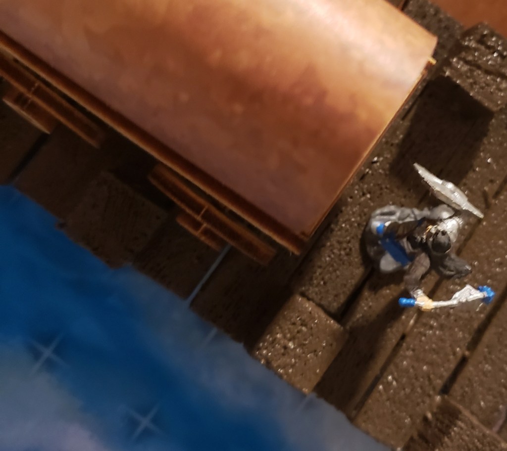 The docks were a flurry of activity and although people were out and about their business, the group did notice a cart off to the side guarded by a pair of soldiers. They didn’t seem too preoccupied about preserving the bodies and were standing far away from the wagon because of the smell. Aleera and Kaladrax provided a distraction, asking the soldiers about what was going on. This drew their attention and allowed Kariss to get to the cart from the opposing direction. She walked up, covering her face with her mantle to manage the stench.