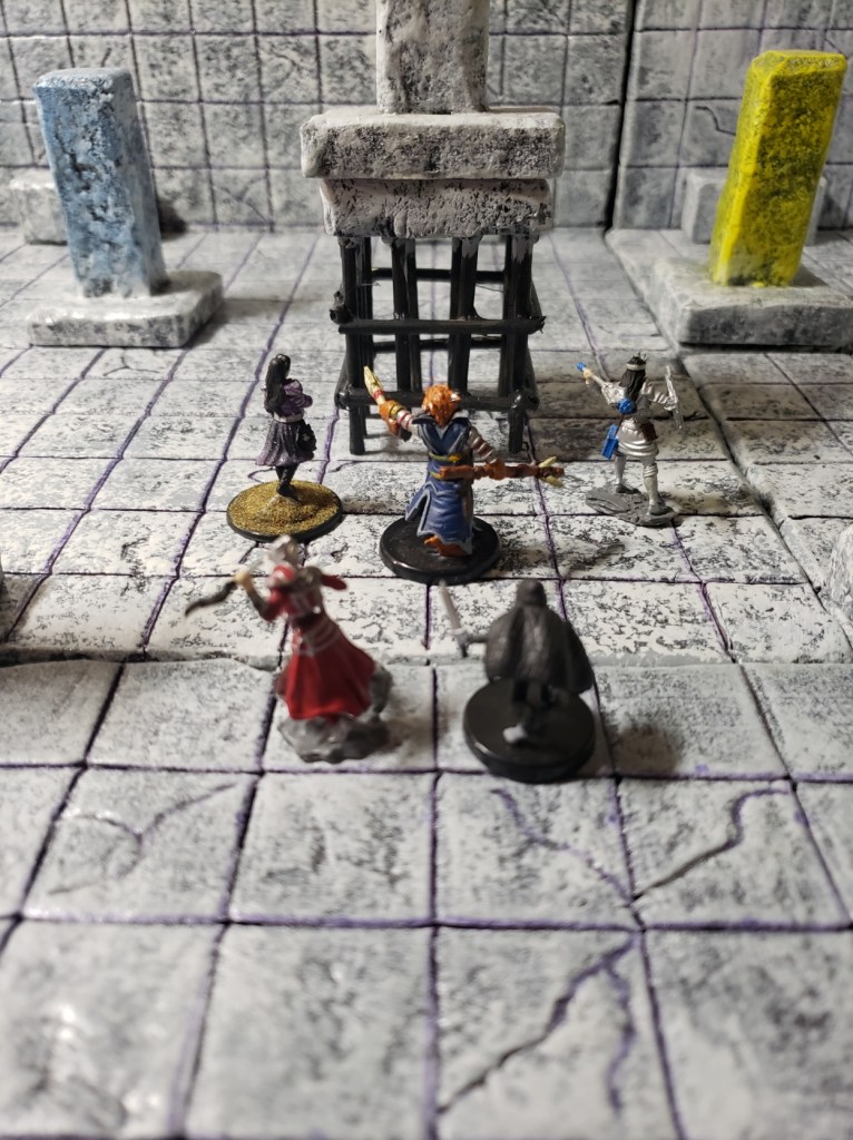 The only other things they could see in the center of the room were the elven pillars. There were four of them in different colors surrounding one neutral pillar in the center. It took a moment to figure out what to do. Kaladrax figured it out first. After seeing the color of the pillars, Kaladrax began thinking that maybe the vigilante had been a wizard like him. If he had been a wizard, magic was a huge portion of their identity. Anything acting as a lock on some loot would be protected by magic. In his studies he had learned that the specific schools of magic were often identified through color. Evocation was the red pillar, conjuration was the blue pillar, enchantment was the green pillar, illusion was the yellow pillar. Kaladrax let them know and asked them to cast at the pillars to activate them.