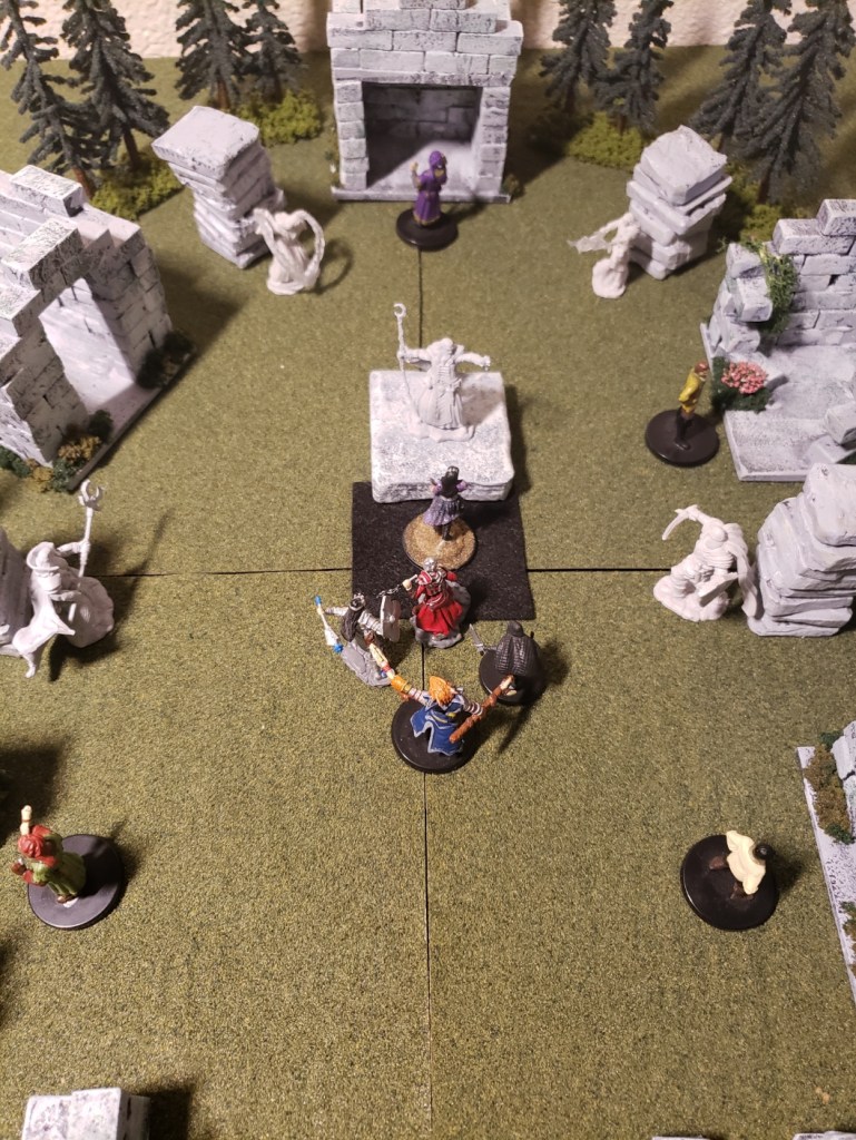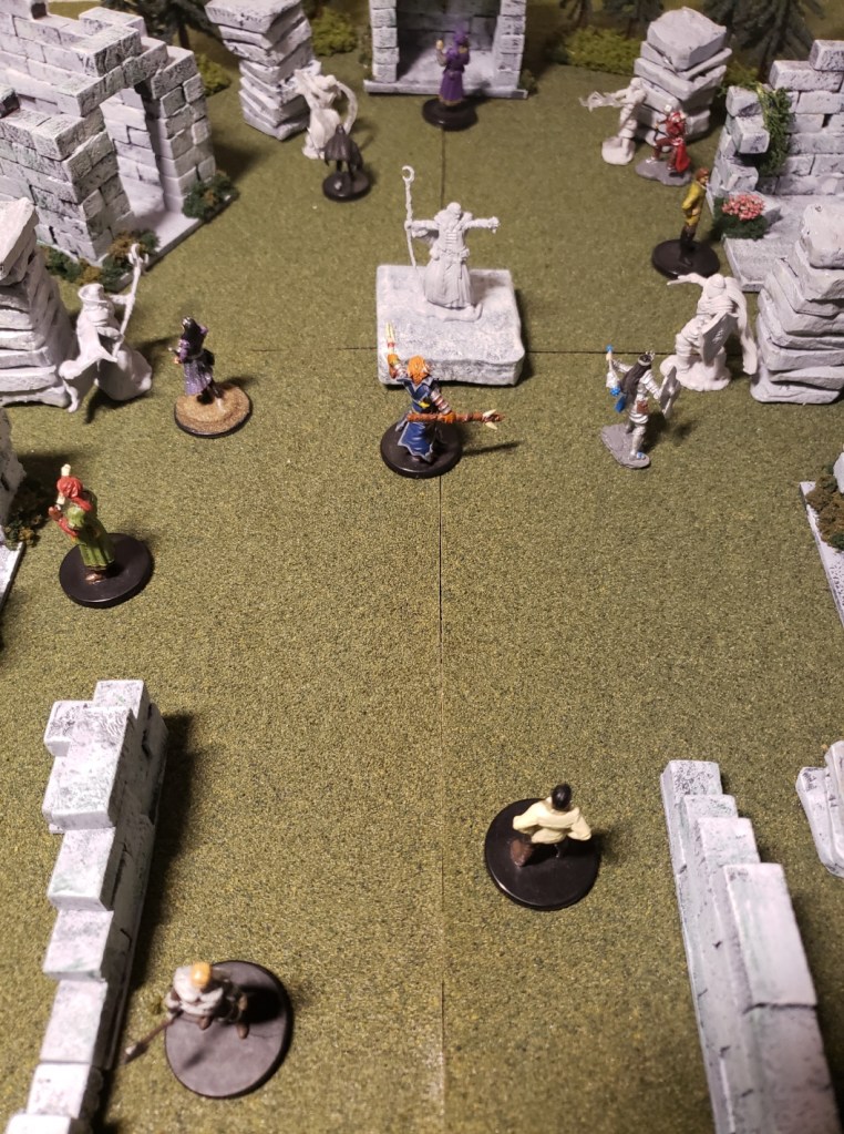 They were ready to make their incursion into the vault and so headed there post haste. Before they re-entered the City of the Dead, they changed their appearances to blend and not be recognized as themselves. Aleera changed into a plain looking peasant wench with her Mask of Many Faces ability. Kariss changed her bright platinum clothing and hair to a more subdued wardrobe and hairstyle. Kaladrax could do nothing about his appearance and so was the only one without a disguise. Milo used his Hat of Disguise to change into his dwarven persona called Dinky Halfpint. Now that everyone was as disguised as they could be, they entered the City of the Dead and headed to Ahghairon’s statue.