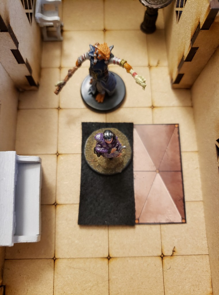 Stuck in the bathroom with the party still swinging outside, the party went over their options and found none. They were trapped in the bathroom. Aleera looked around for a moment before a sly smile came over her face. She asked the others to step away from the center of the room and when they were clear she changed, using her necklace, into a robe with multicolored patches on it. With a swift move, she removed one of the patches and dropped in the center of the bathroom.