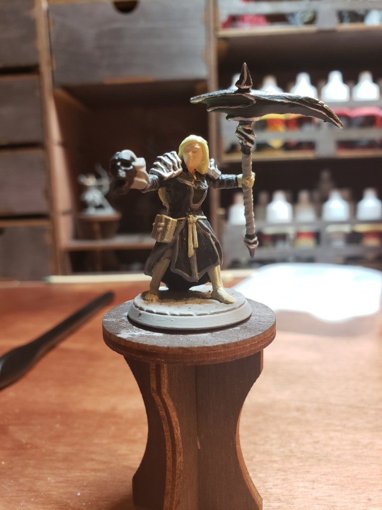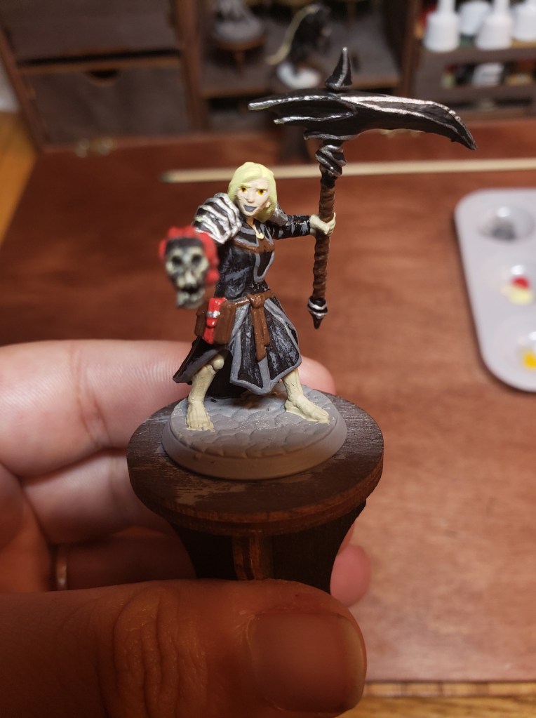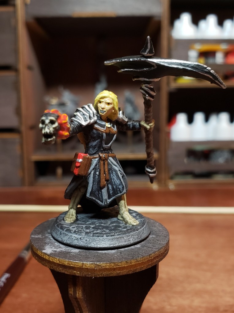 Next, I painted the leather on the scythe, around her waist, and on the book. I also painted on the skin on her face. The skull is also black as the base so I can dry brush the bone color over it.