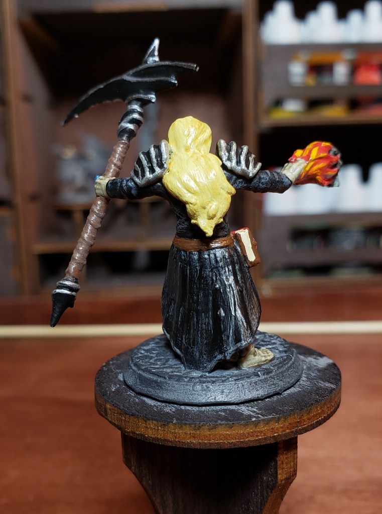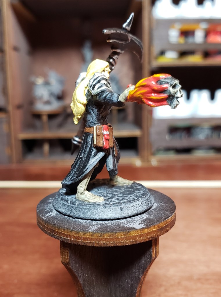 Front shot of the miniature. I added a grey drybrush to the black clothing to add depth. I added accents on the book strap the collar had a bit of brown on it for dimension. The flames on the skull are pretty cool.