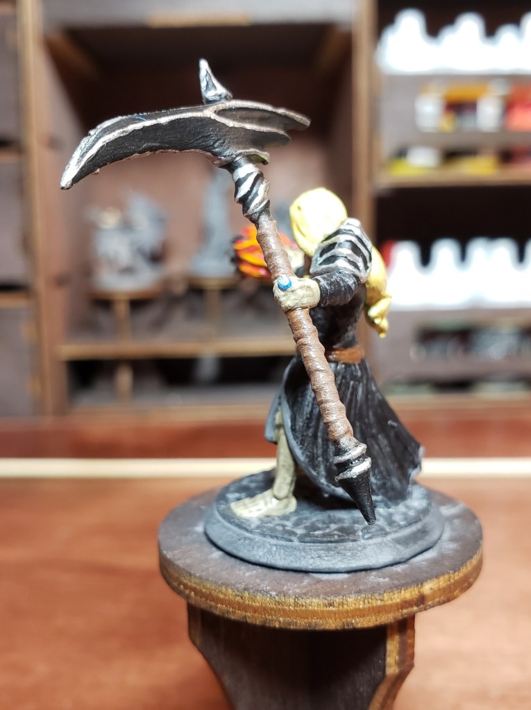 Side shot of the other side. She has a blue sapphire ring on her hand that I enhanced with a bit of silver mixed with blue for a bit of a shimmering shine. I dry brushed a light coat of lighter brown to the leather of the scythe to add depth. I loved this paint job as I had to make sure to keep to the specifications on the color palette. It was a challenge and the commissioner was satisfied so win win!