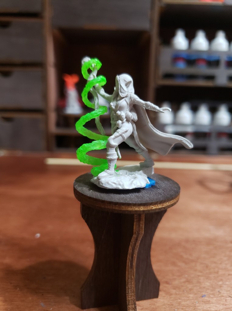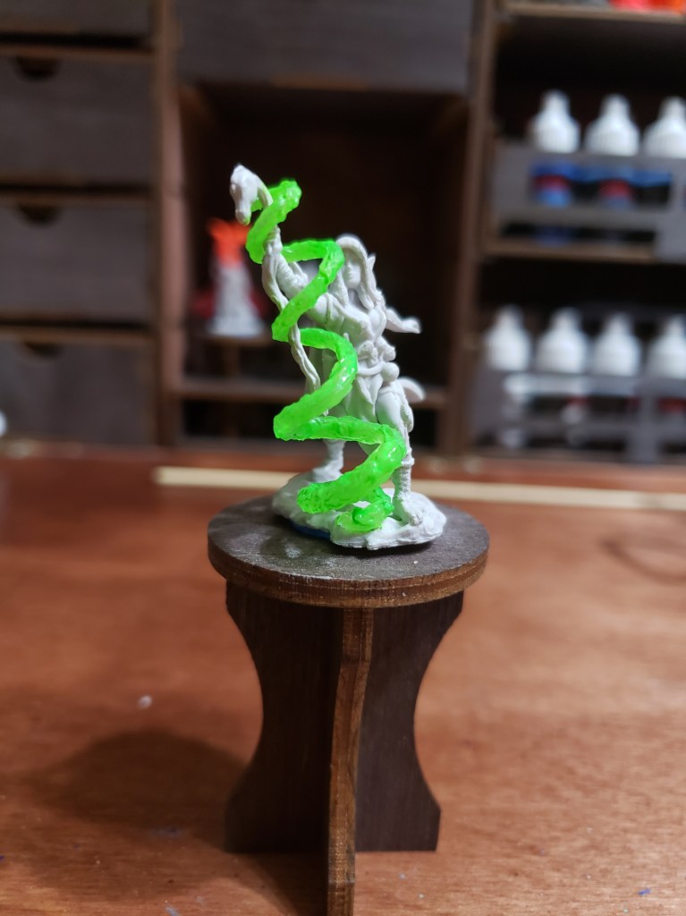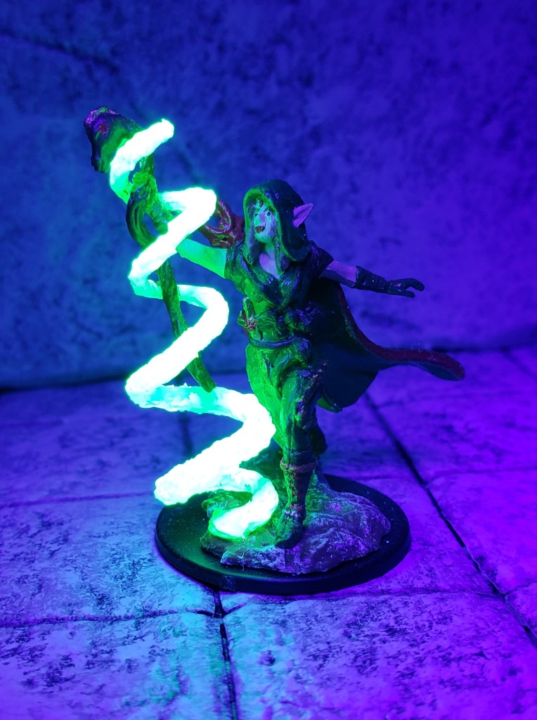 I couldn’t wait to try out my fluorescent paints, newly acquired from Warcolours.com. (They didn’t pay me for advertising or anything, I bought the paints and loved them so much I think people should get them if they want cool effects.) I began with a few layers of the fluorescent green to paint the spell effect coming from the staff.