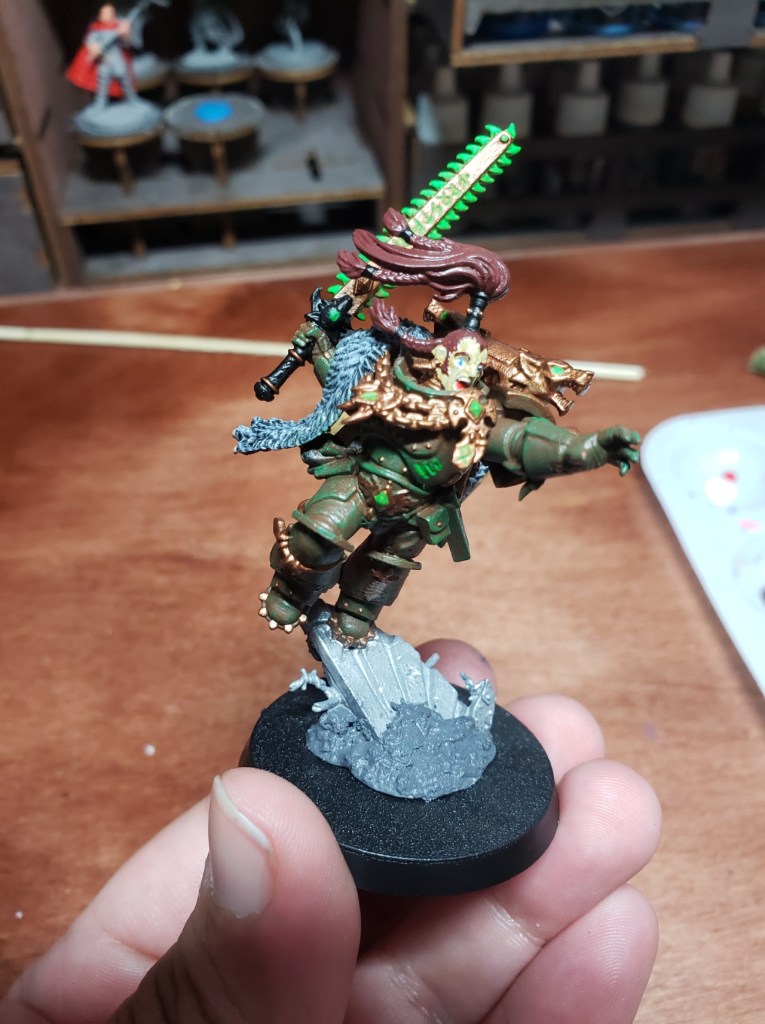 This is a front shot of the miniature. I added bronze accents all over the armor to pair with the fluorescent green and give it more pop. The tips of the shoes and even the buttons on the pouches are all bronze.