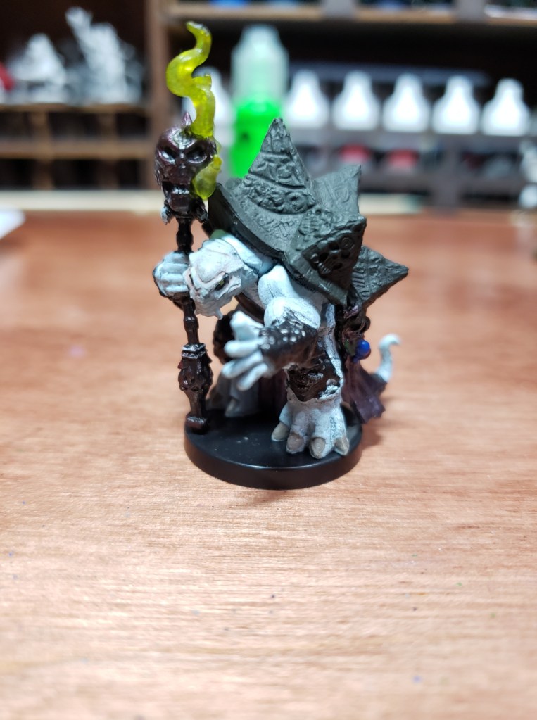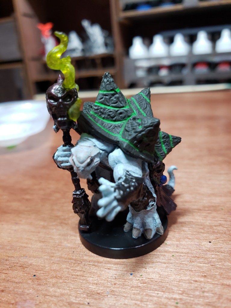 I also thought the green complimented the colors of the miniature. Green matches well with the blue of his skin and the yellow-green of the necrotic flame on the staff. I wanted the runes to have a similar necromantic glow.