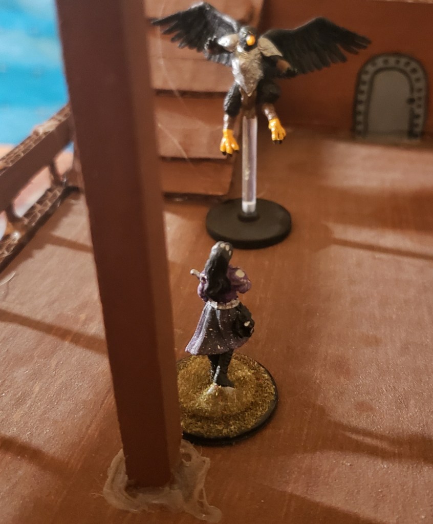 She followed the bird relentlessly, finally cornering it on it’s small ship. She telepathically asked Kariss to signal Kaladrax to bring the ship around the way they were going. On the deck of the enemy ship the bird came to a stop with nowhere else to go. The hood fell away from the face to reveal a male Aarakocra with shining black feathers. He squared off against Aleera, ready to fight for his life.