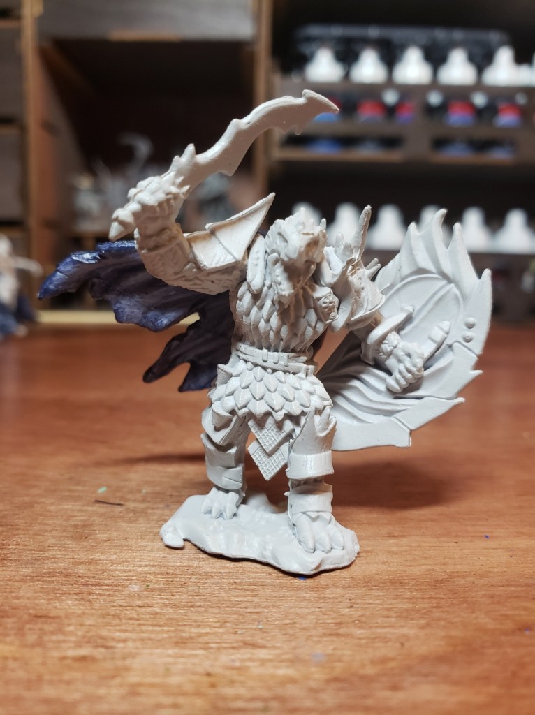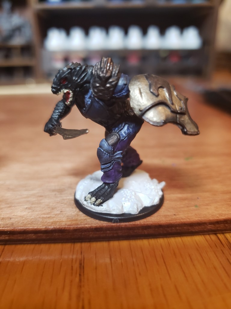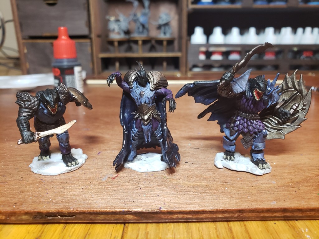 They were all dark toned and I used shadow wash to add some depth to the clothing. I also used purple for the second color of their armor and used the dark metallic bronze to add small details like buckles to the armor. There were two black Dragonborn and a helmeted Dark Knight.