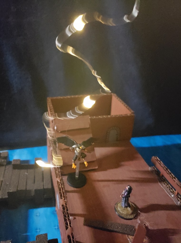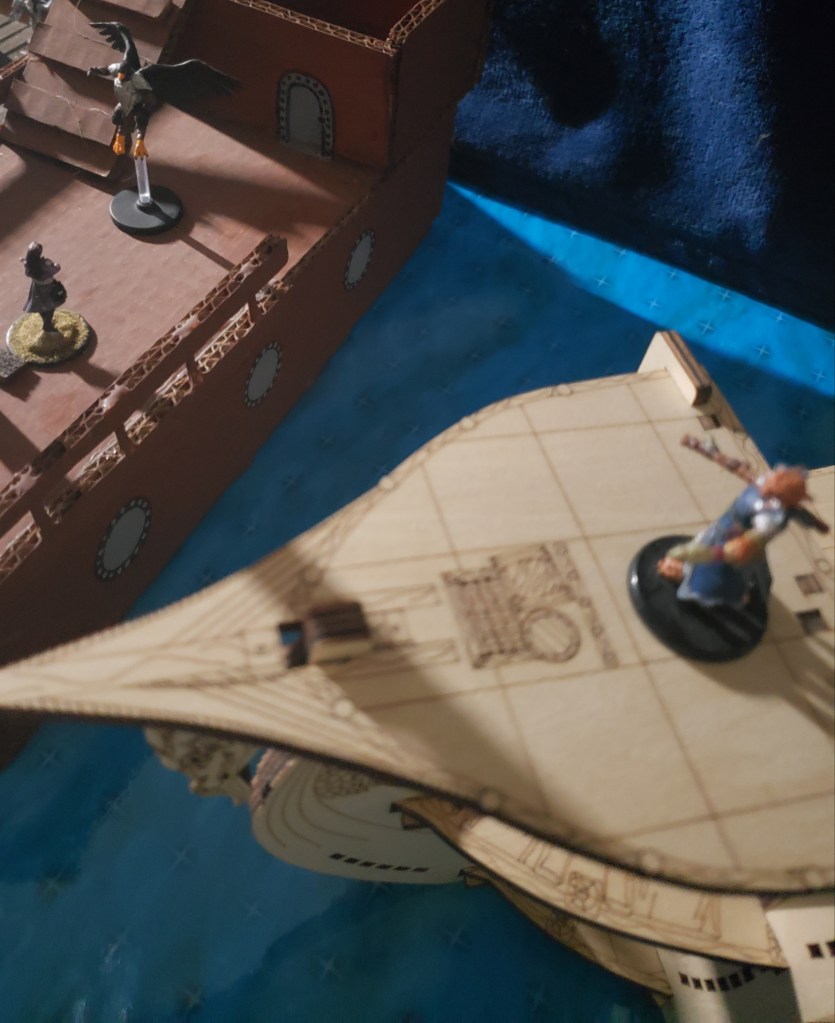 Back on the ship, Aleera was throwing spells back and forth with the flying pirate. The storm was strong enough that even he could not ride the winds. Aleera herself was forced to stand upon the deck of the rocking ship. Neither could fly but that meant neither could escape and Aleera had no intention of leaving without the last power. She kept him on his toes hoping to land a good Witch Bolt. It would mark him with the symbol of the Traveler and seep the power from his body and transfer it to hers. The rest of the party just thought she gained the power but she was actually their temporary prison while she gathered them for the Traveler. He was a god but from a different world and could not cross over all the way into their world.