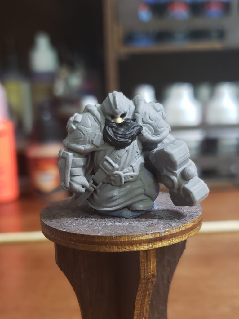 Dvalin Thornshield is the son of an important NPC from our last campaign, Gralmor Thornshield and a yet to be revealed mother. They were both important people in our campaign but the player hasn’t figured it out yet so, she shall not be named! I began by painting the small amount of visible skin on the miniature, his nose. Then I blocked out the beard in solid black also adding some to the eye sockets to begin making the shadows from the helm over his eyes.