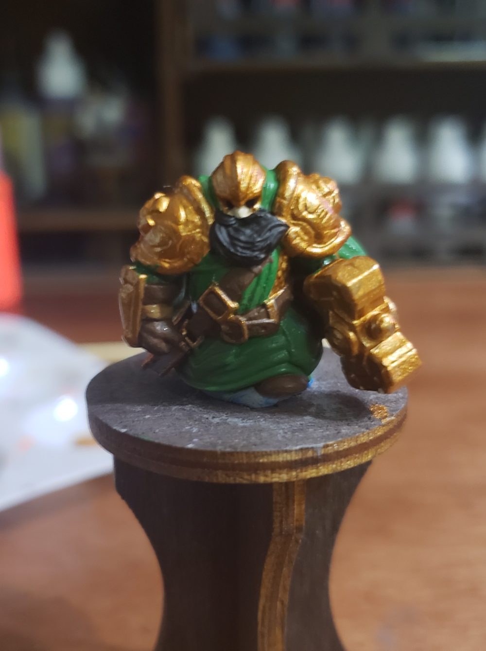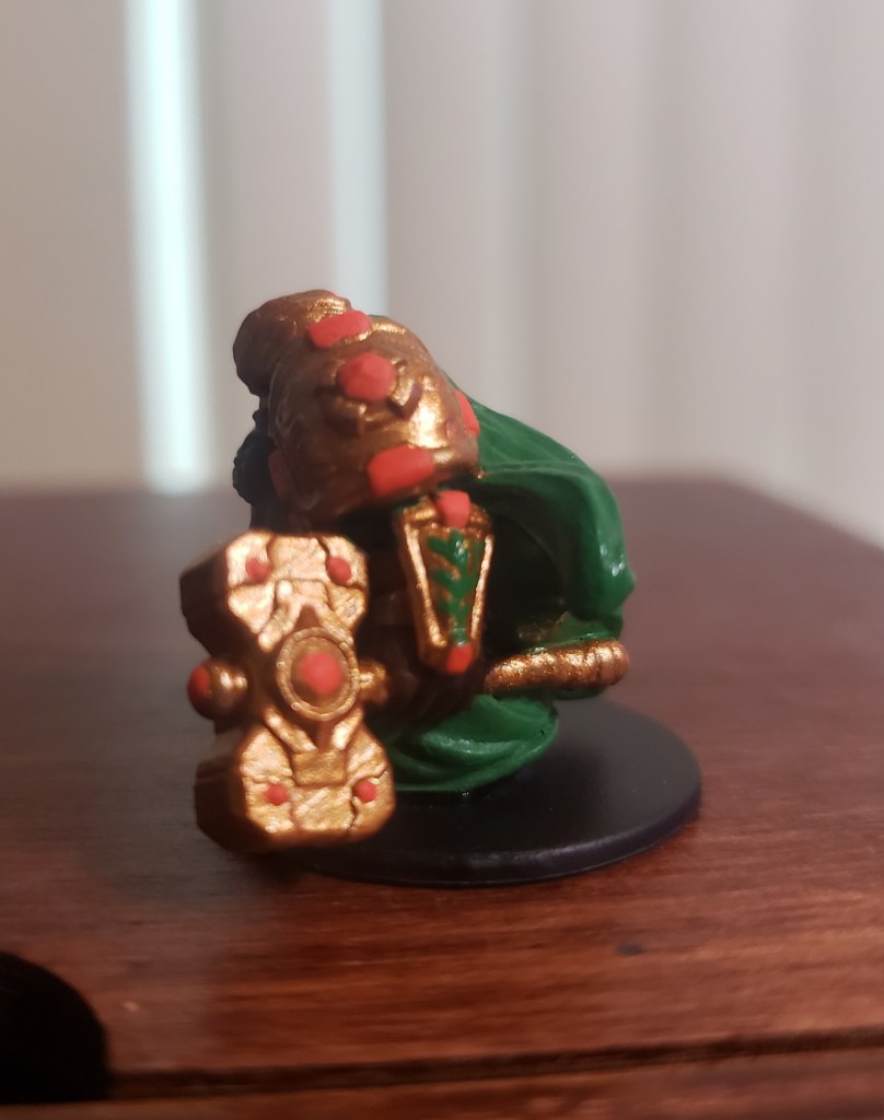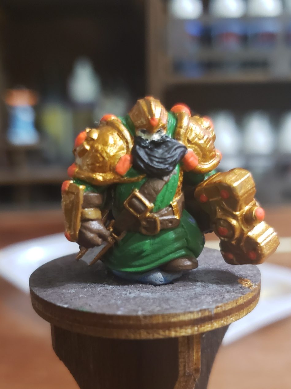 Next, I blocked out the colors of the armor. There is a green under tunic, banded together with dark brown leather straps. He also has a golden helm, pauldrons, bracers and his forging hammer. The buckles on the leather straps are also gold. You can also see a basic leather shoe peeking out of the bottom of the miniature.