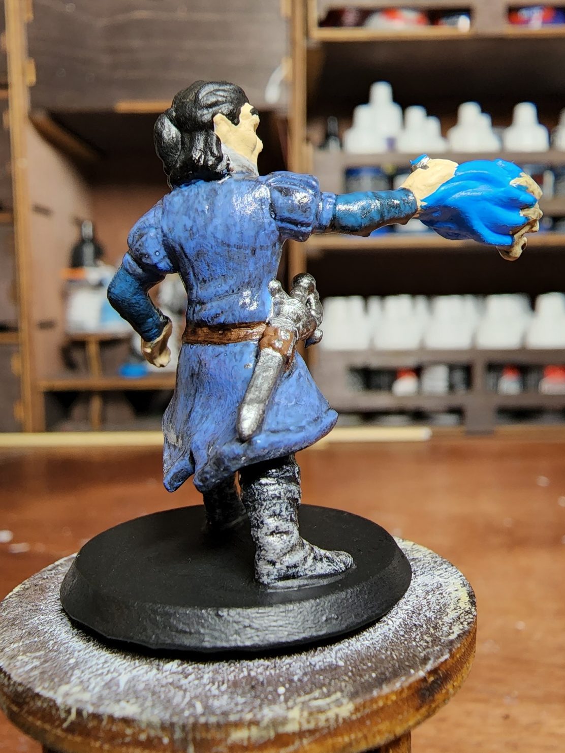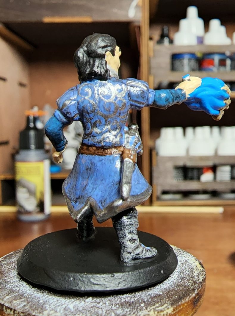 Front and back shots of the miniature: I began painting the base colors for his clothing. Since Neverwinter’s colors are blue and silver, I used that as inspiration for his look. I used two different blues for the base and black for his boots. I also added some eyebrows to match his hair. I painted these in multiple layers with watered down colors to give the skin and clothing a smooth look.