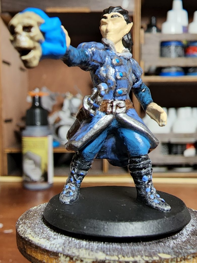 For the lips, I used a darker skin tone to add depth to his face. He has blue eyes so I tried to match them as best as possible. I have to say this is probably the best face I have painted to date. The eyes are in the right place and his expression is a very unimpressed smirk. I was really happy with how it came out. As a final touch of flare I also added silver striping to his pantaloons.
