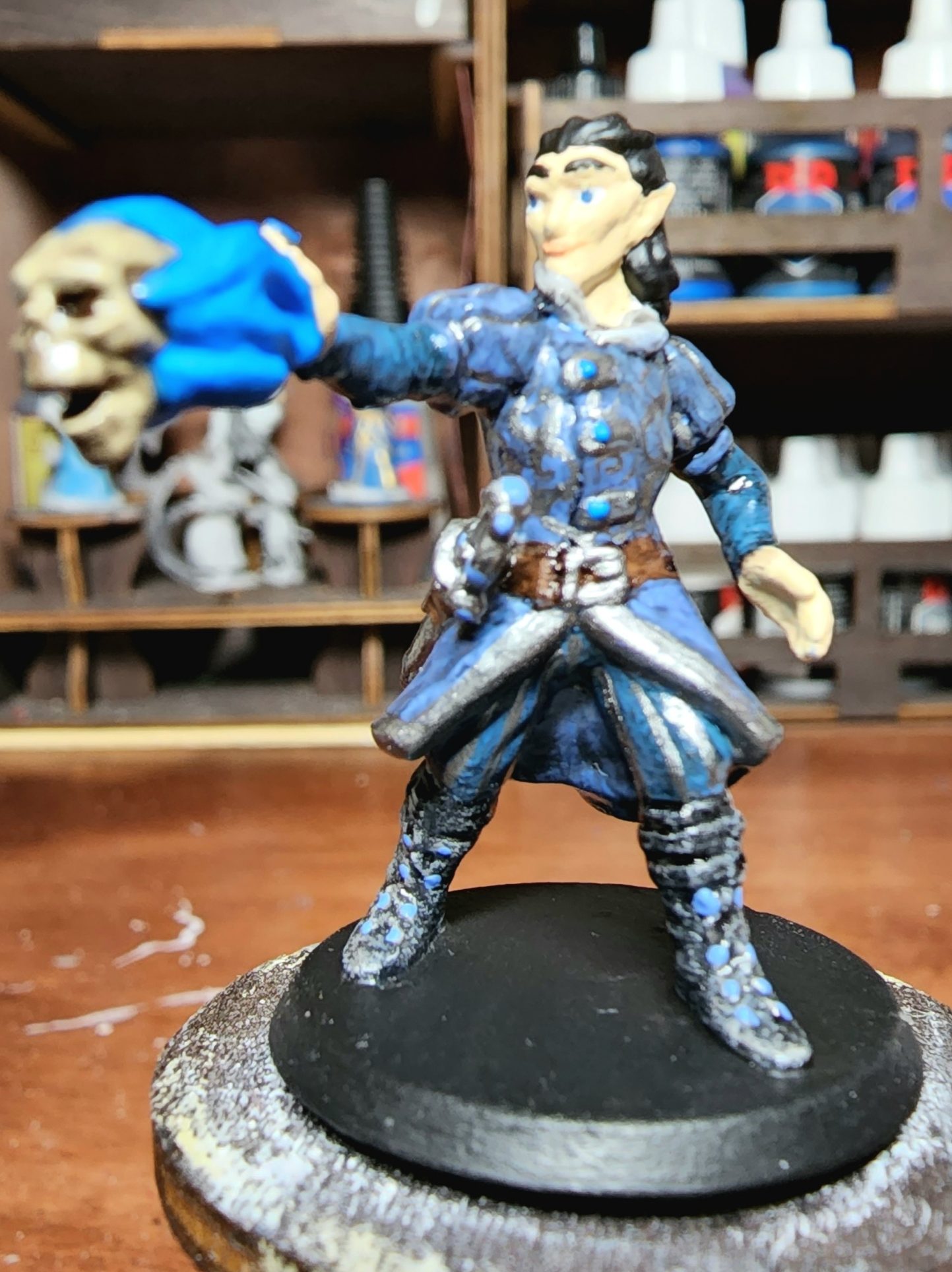 Zephyr Raventhorn is the Lore Bard in our current campaign. He is the descendant of two very old bloodlines. His mother was an elven princess and his father was the heir to the crown of Neverwinter. Neither knew the other’s royal status until his father was taken back to Neverwinter leaving behind a pregnant elven wife. She became a seamstress after their farm was taken by his greedy uncle and raised Zephyr until she fell ill and died. When his uncle took the seamstress shop too, Zephyr was left to make his own way in the world. After priming, I painted his skin color and hair.