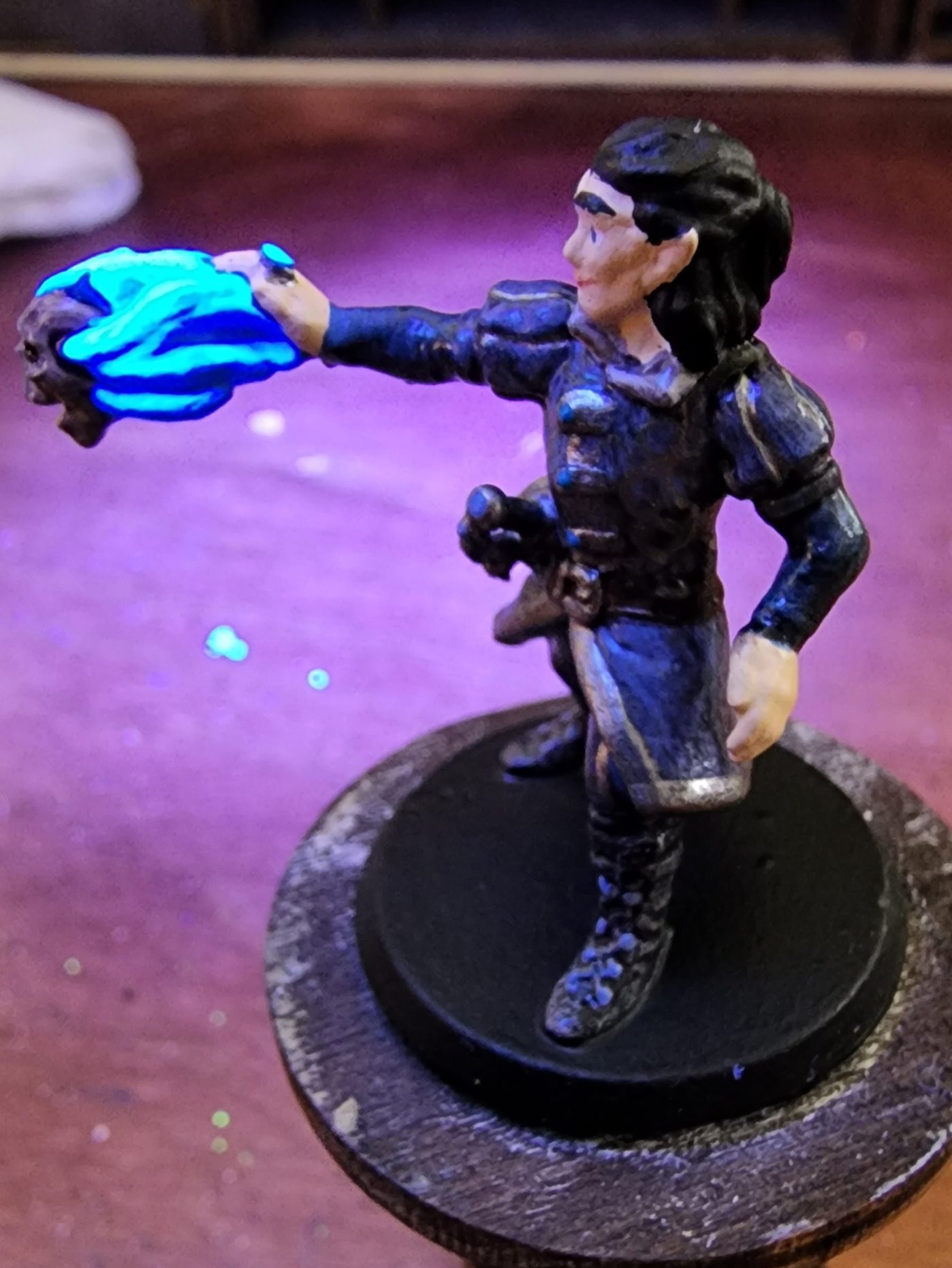 I also painted his sword silver, held in place by a simple, brown leather belt sheath. If you look closely, I painted a ring on his hand, his royal ring given to him in a letter addressed to him by his mother. I added a bit of the fluorescent blue to the ring too to make it glow along with his magical effect. I dry brushed some gray over the boots to add dimension and painted the base black.