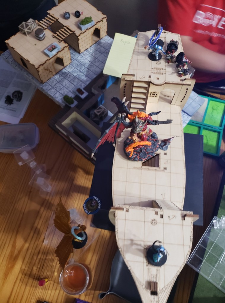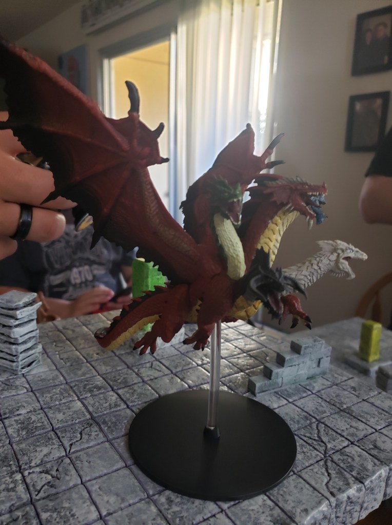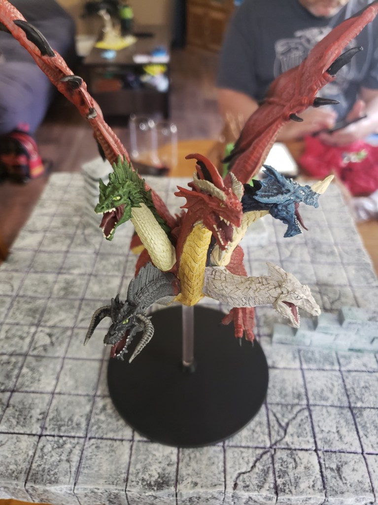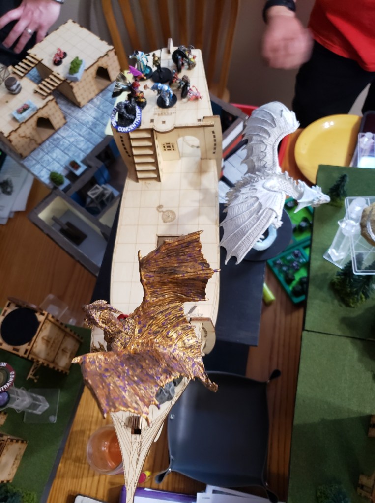 Kaladrax saw this and could not accept defeat. He gathered up his strength and cast a Wish spell to restore everything to what it had been before the meteor hit the ship. A bright light encompassed the group and what was once wrought was brought back together again. The ship looked as it did when they first entered the Feywild. All the people that had been dead or lost were back, looking confused but relieved. The assault on the queen continued until they wore her down long enough to separate her from the vial of god making potion she had. Once it was in their possession, they finished off the Knight and his Queen. The fight was nearly over, all that was left was Tiamat, alone in her fight against order and law.