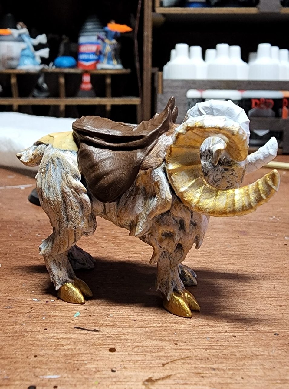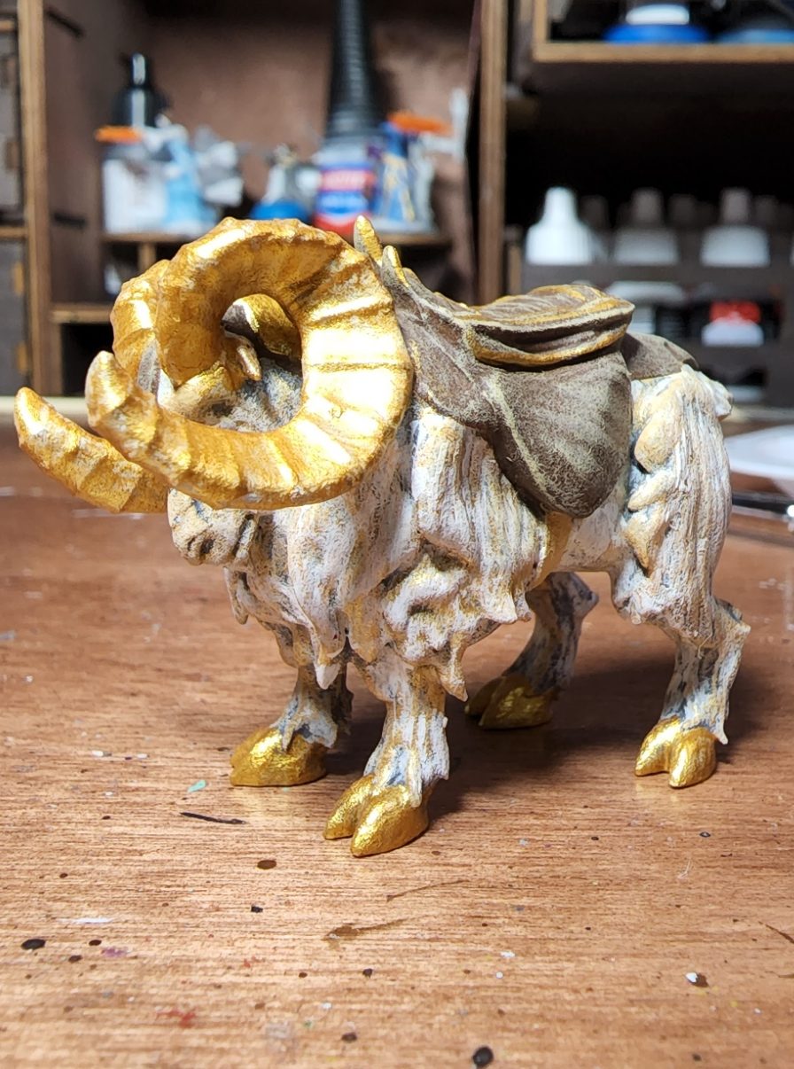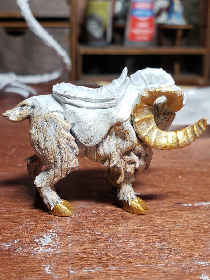 I added a final dry brush of the fur with some gold paint. It adds a nice shine to the fur the really evokes a celestial origin to me. I also began painting the hooves in solid gold and the horns in solid gold as well. Descriptions of Heimdall, Brenna’s patron, say that he is a golden man with golden hair, skin and raiments so I wanted my ram to represent that.