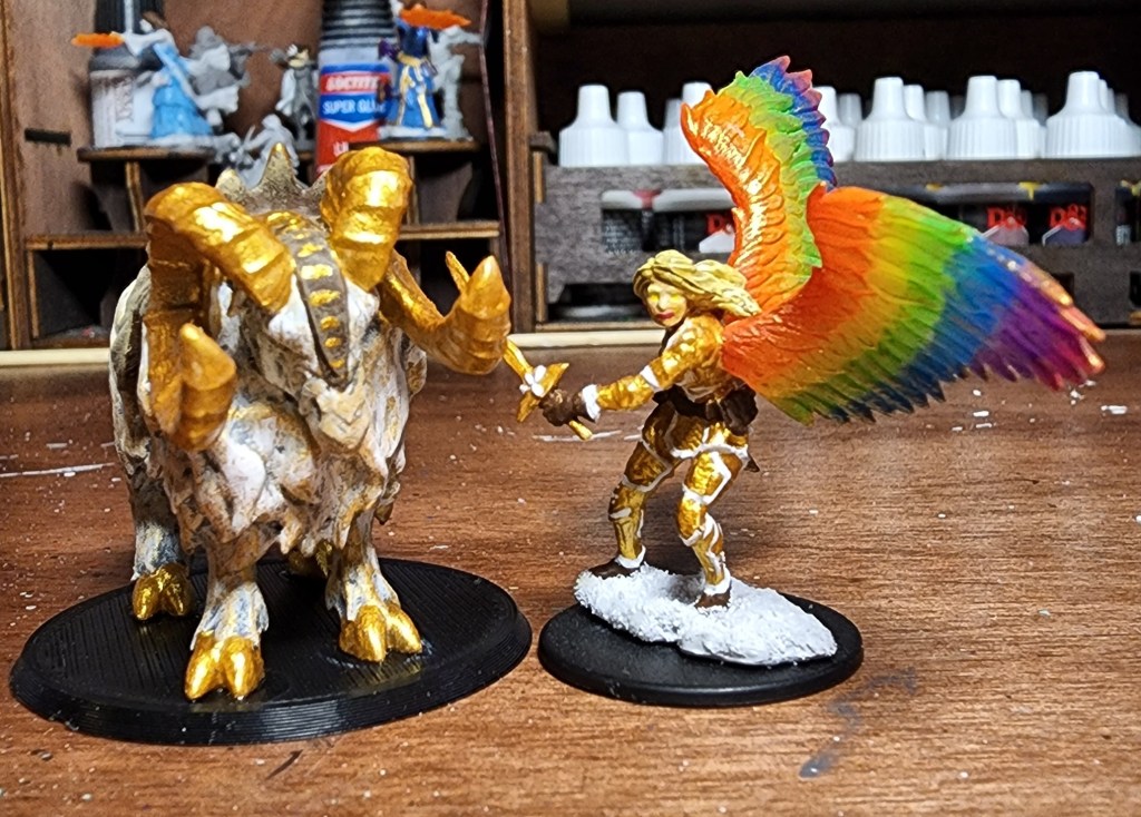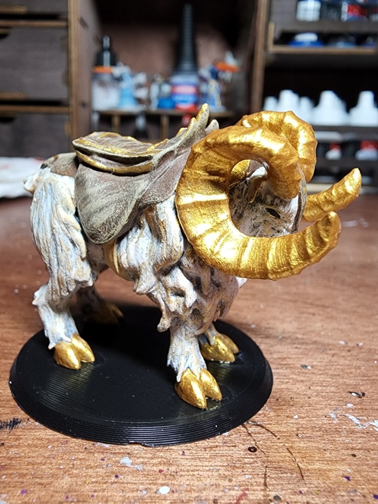 Gjallarhorn is my Watcher Paladin, Brenna Wolheart’s, steed in our current campaign. M y husband bought him for me on Etsy. Since it is a celestial spirit, I wanted the ram shape that it took to reflect that. I used a new white primer on the miniature to start.