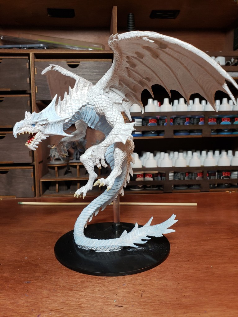 This is a shot of the back of the wings. They have they grey dry brushing to deepen some of the shadows around the wings. This adds more depth to the paint job than just leaving them straight white. White dragons aren’t completely white and grey either I wanted to add a hue of something else and the natural color to chose was a cool blue for the underside of the dragon.