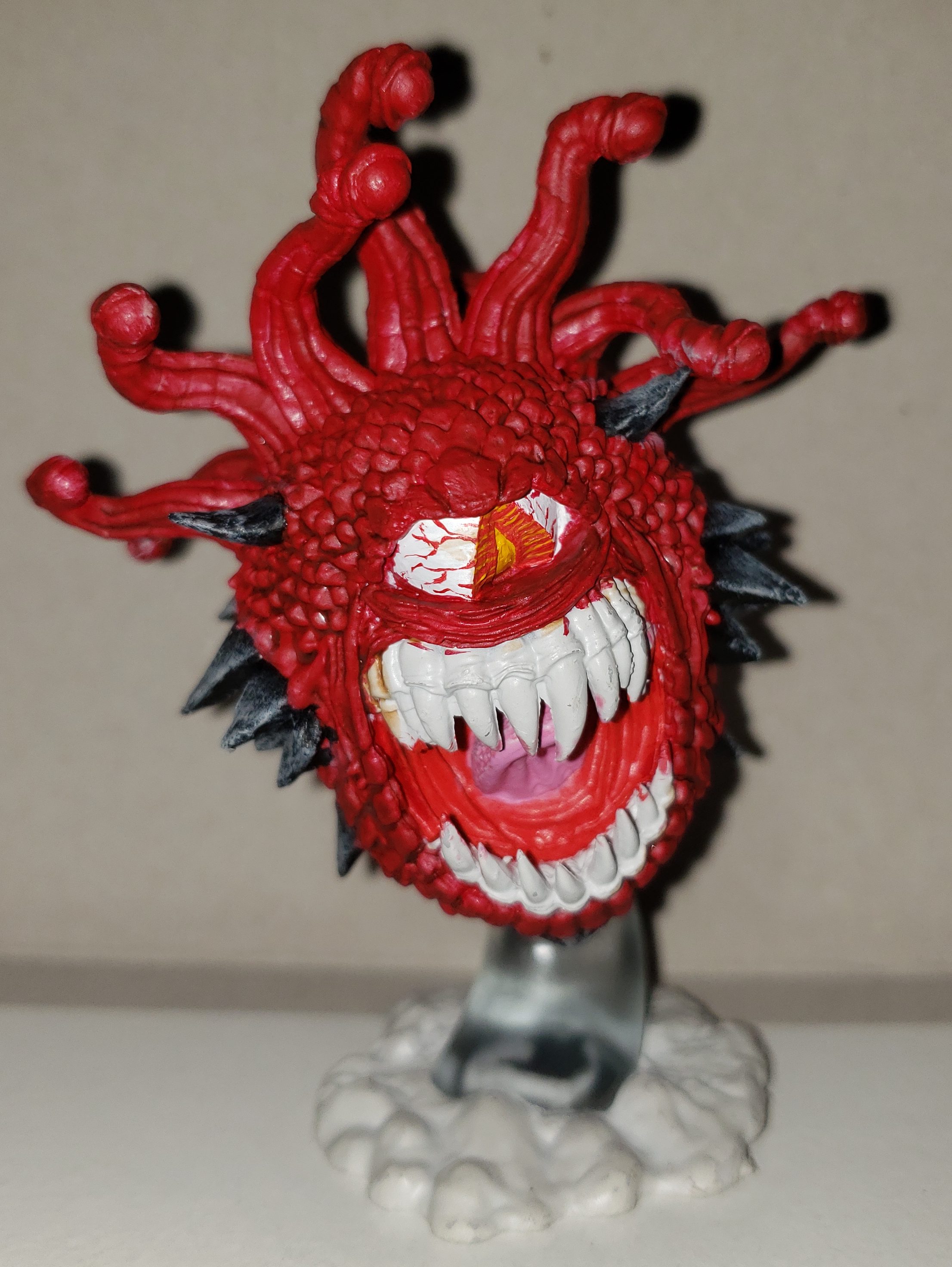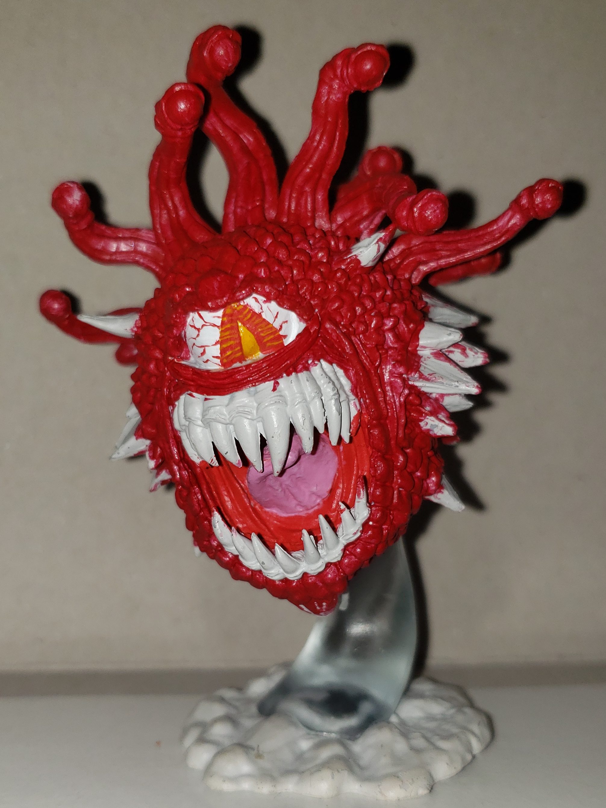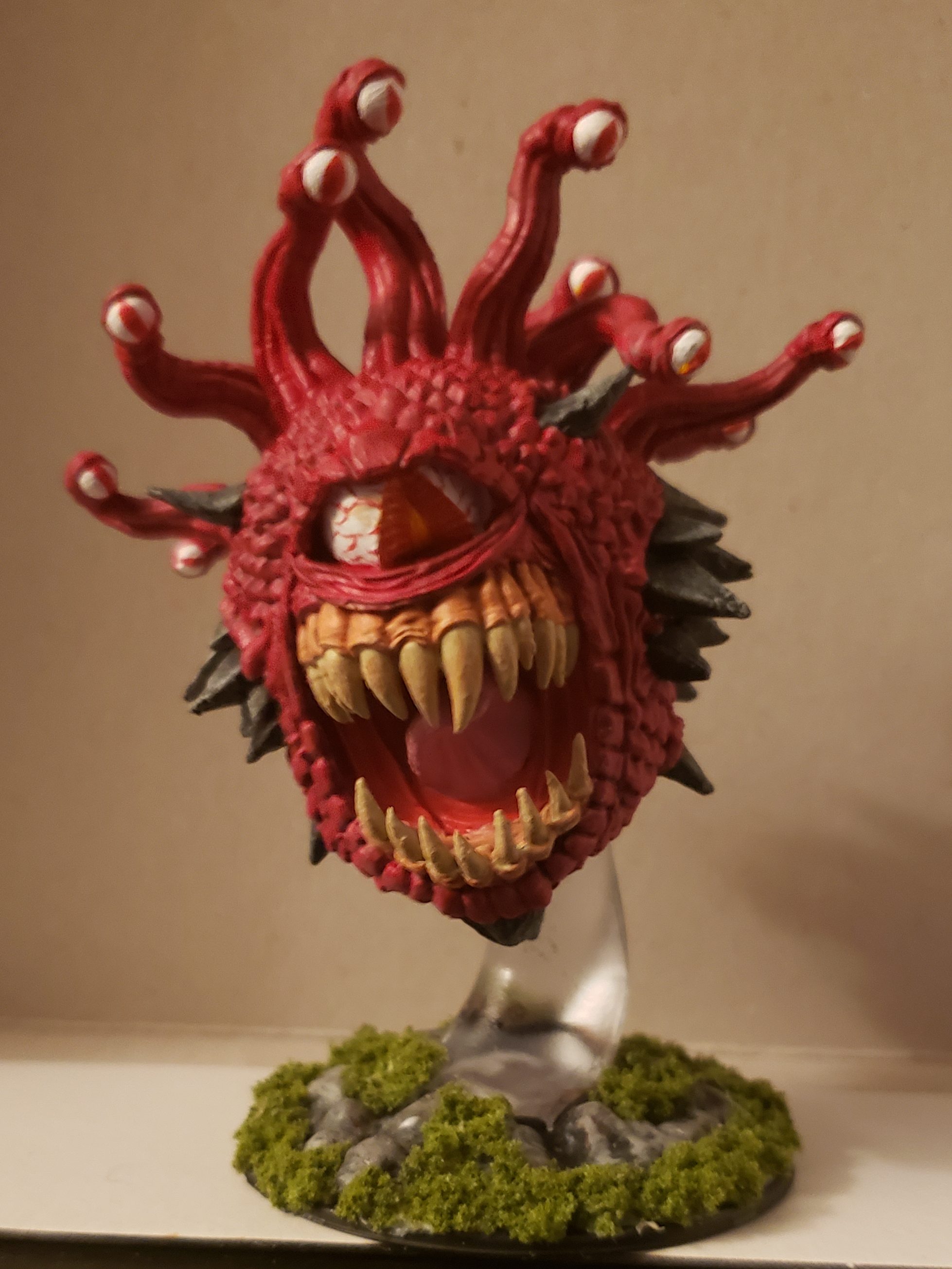 I started off by painting most of the Beholder in a deep but bright red. I started on the eye right after and wanted it to look like a cross between a demonic and human eye. I started with a white eyeball and added some nice red veins branching out through the white. I painted the pupil the same bright red and the iris a golden yellow. I also added golden yellow lines to the pupil to add dimension to the eye.