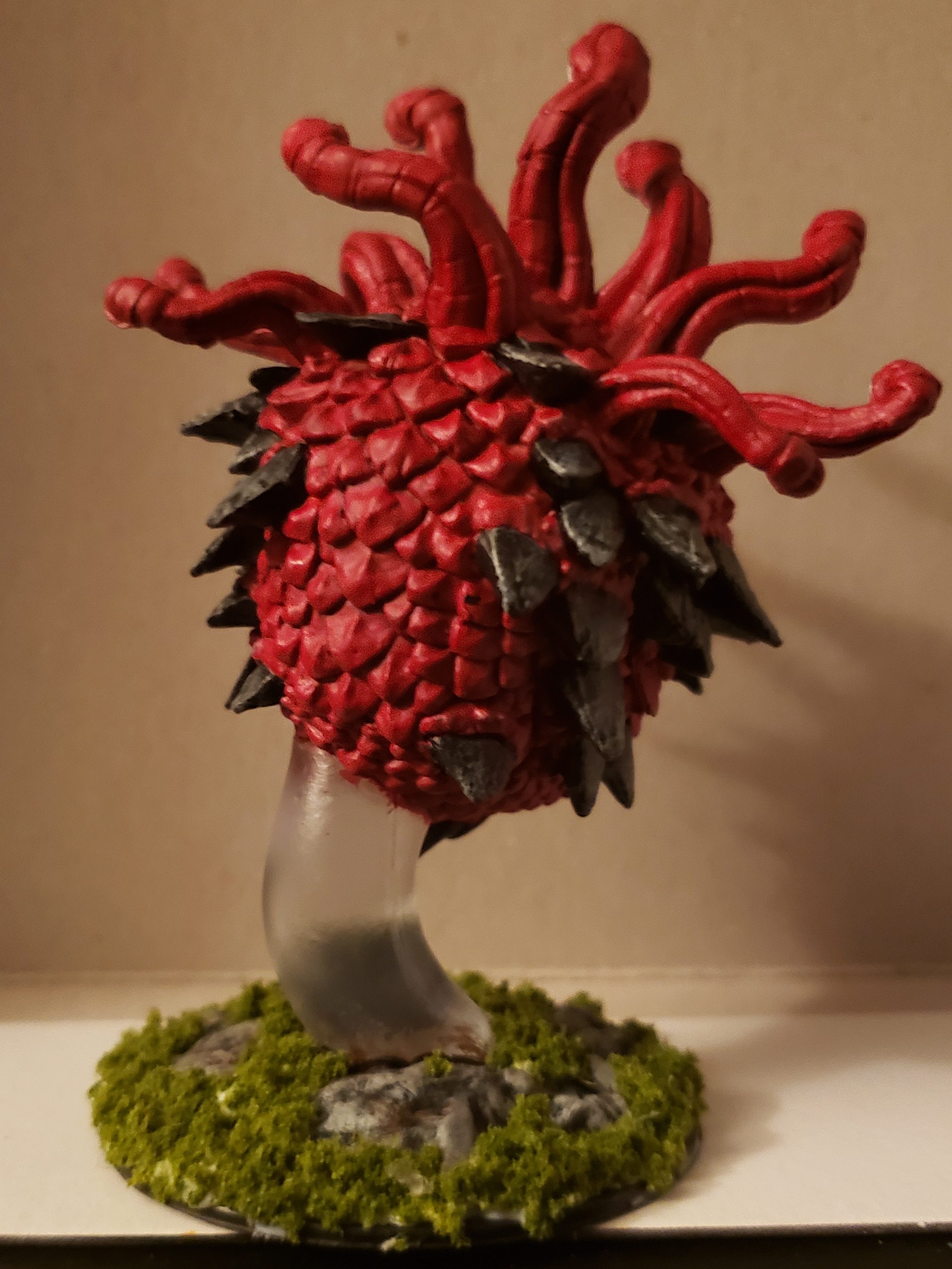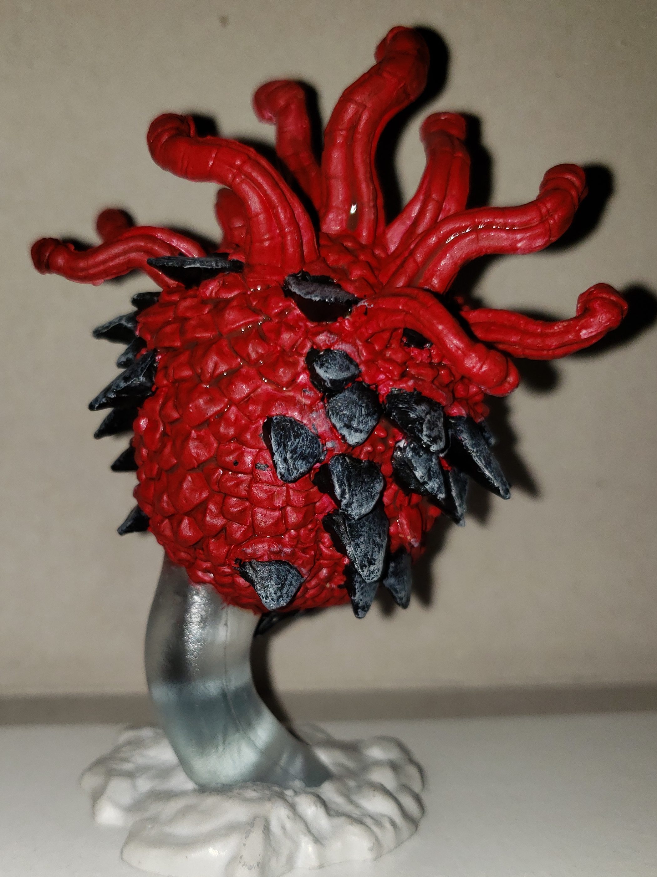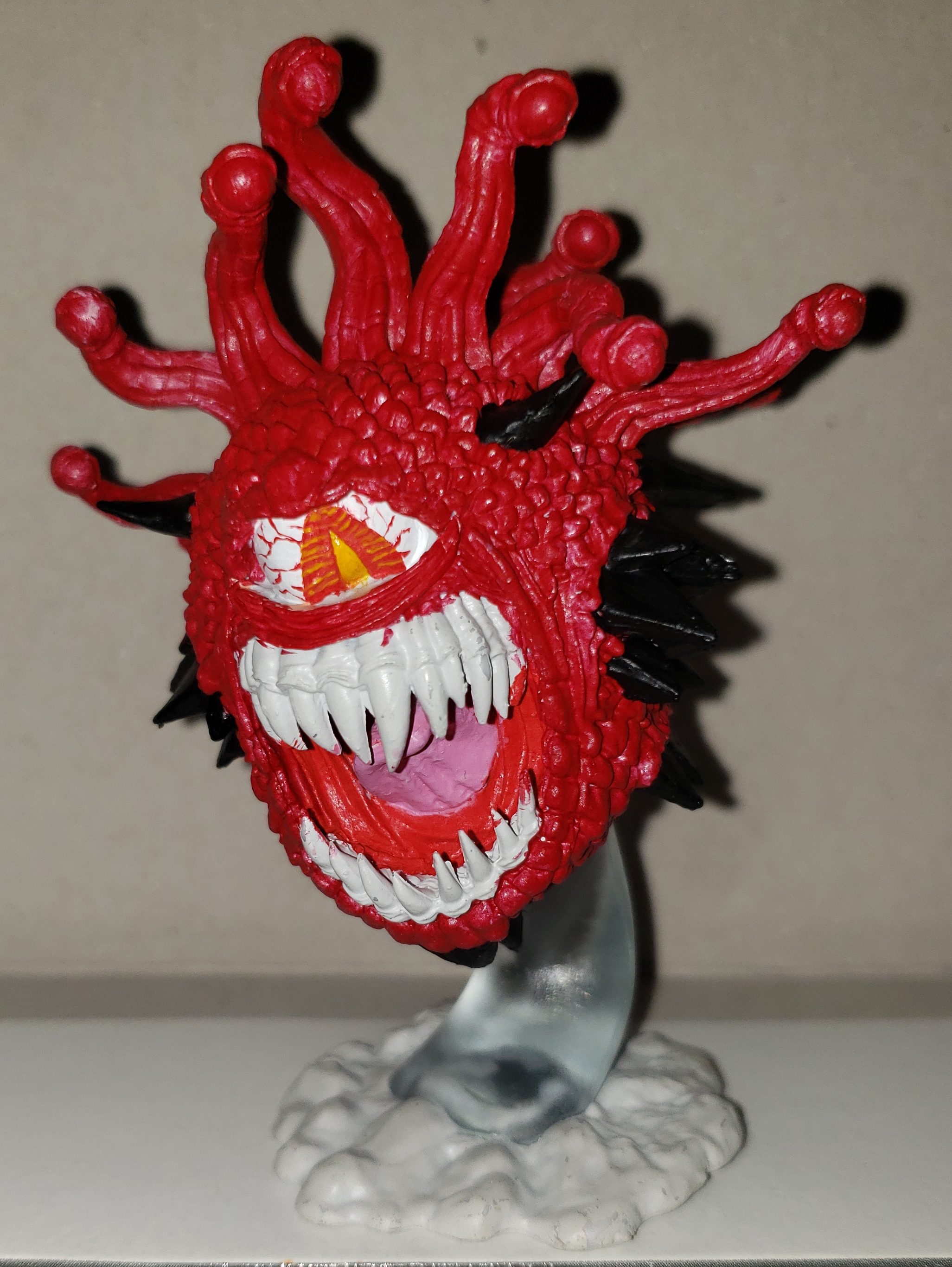 I started off by painting most of the Beholder in a deep but bright red. I started on the eye right after and wanted it to look like a cross between a demonic and human eye. I started with a white eyeball and added some nice red veins branching out through the white. I painted the pupil the same bright red and the iris a golden yellow. I also added golden yellow lines to the pupil to add dimension to the eye.
