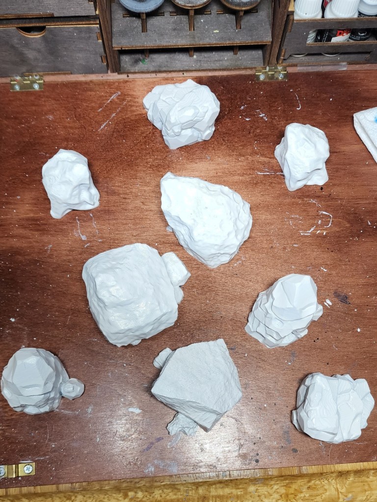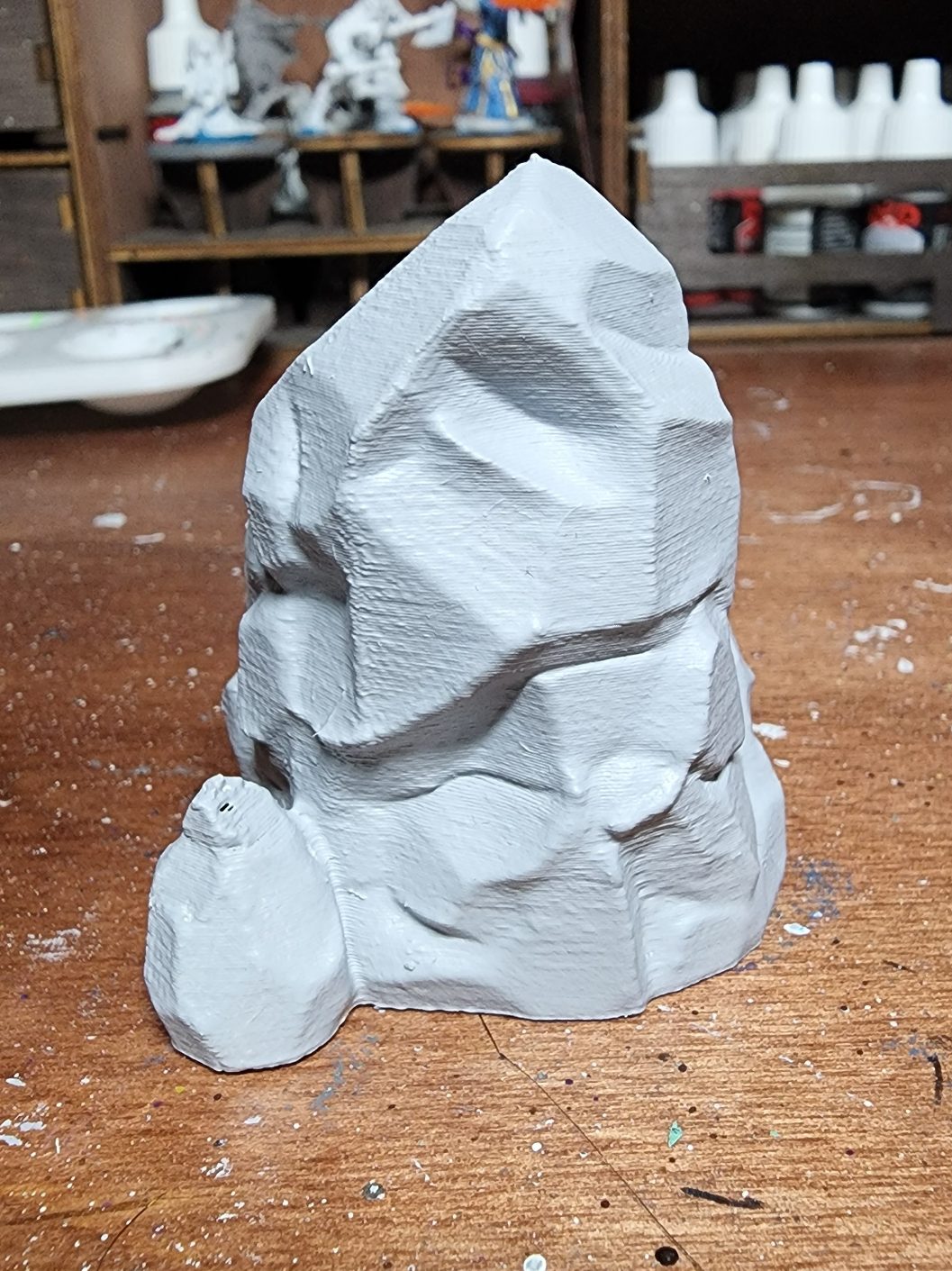 A friend of ours got these for us as a gift and since we are running an ice themed module I wanted to paint them a certain way. My husband helped cut out a lot of middle ground by spray priming the set pieces while I was at work so I could paint them when I got home. He applied about three layers of white primer to fill in some of the 3D printing lines still showing.