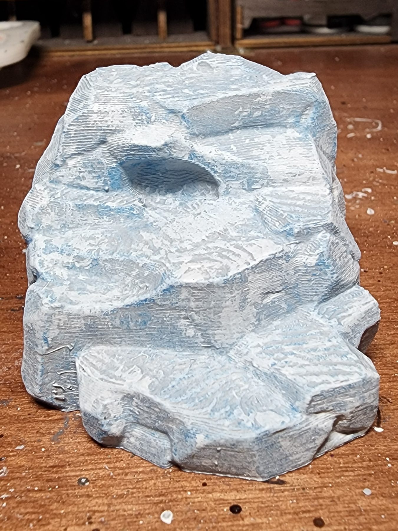 I love painting ice, It has been so fun painting miniatures and set pieces for this campaign. It really made me have to up my painting game. I finally perfected the way I like to paint ice. I started off by painting all the pieces in a light grey for the “shadows” in the ice. I know it doesn’t look like much of a difference from white but the work is not over.