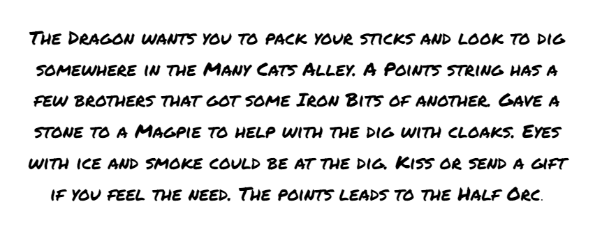 We went all out for this campaign. We made handouts and created background paper trails for our players to follow and have. One of the awesome things we began doing was give our Rogue, Mythe, notes written in thieves cant. It really helped bring his missions and interactions with NPC’s to life. Below is his first ever note and mission. Can you decode the message? Let me know in the comments here or comment under the Twitter or Instagram posts.