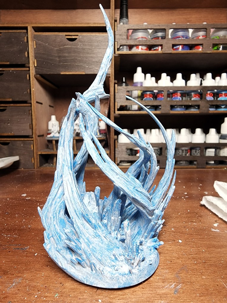 Using a bright, frosty blue, I gave the base a liberal dry brush. Some parts look really saturated but I would rather have more color to work with than not when it comes to painting ice. It looks more like water at this stage but I still have more steps to go through to make it ice. The important part is that there are still plenty of areas where the light gray come through.