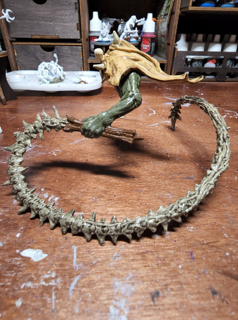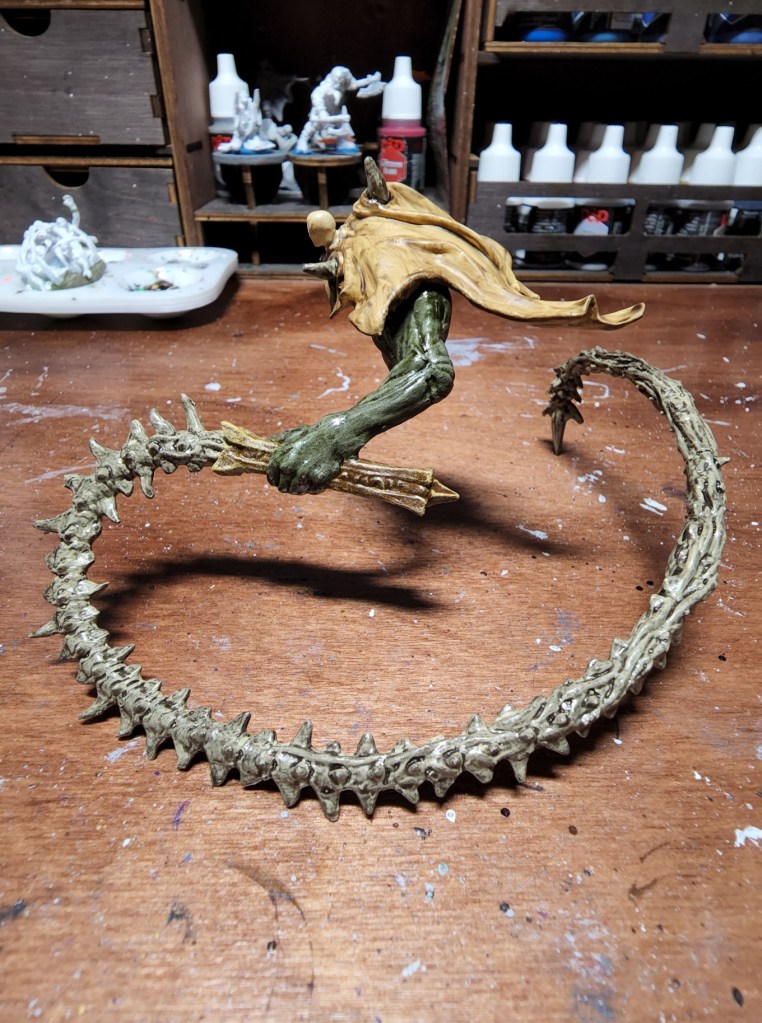 As part of the final touches, I added some Dark Tone wash to the bone spikes on the shoulder and some Flesh Wash on the mounted head to deepen the shadows on it but not too much. I also added a light tan dry brush to the handle of the whip to finish that off too. I would say this part of the piece might be done with perhaps one last touch to add.