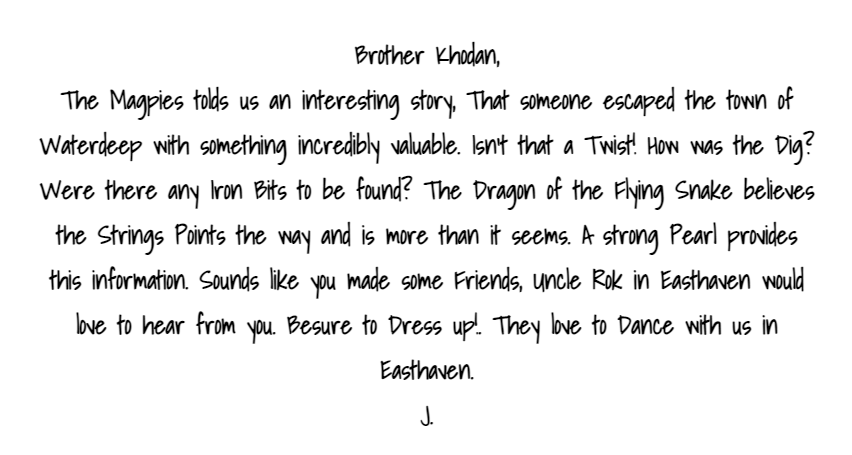Last week I released the second note that our rogue, Mythe, received from his hooded thief friends. I love these wacky innocuous notes that anyone can read but not everyone can understand. It seems like a great way to communicate in an age where correspondence might not be completely private. Here is the translation.
