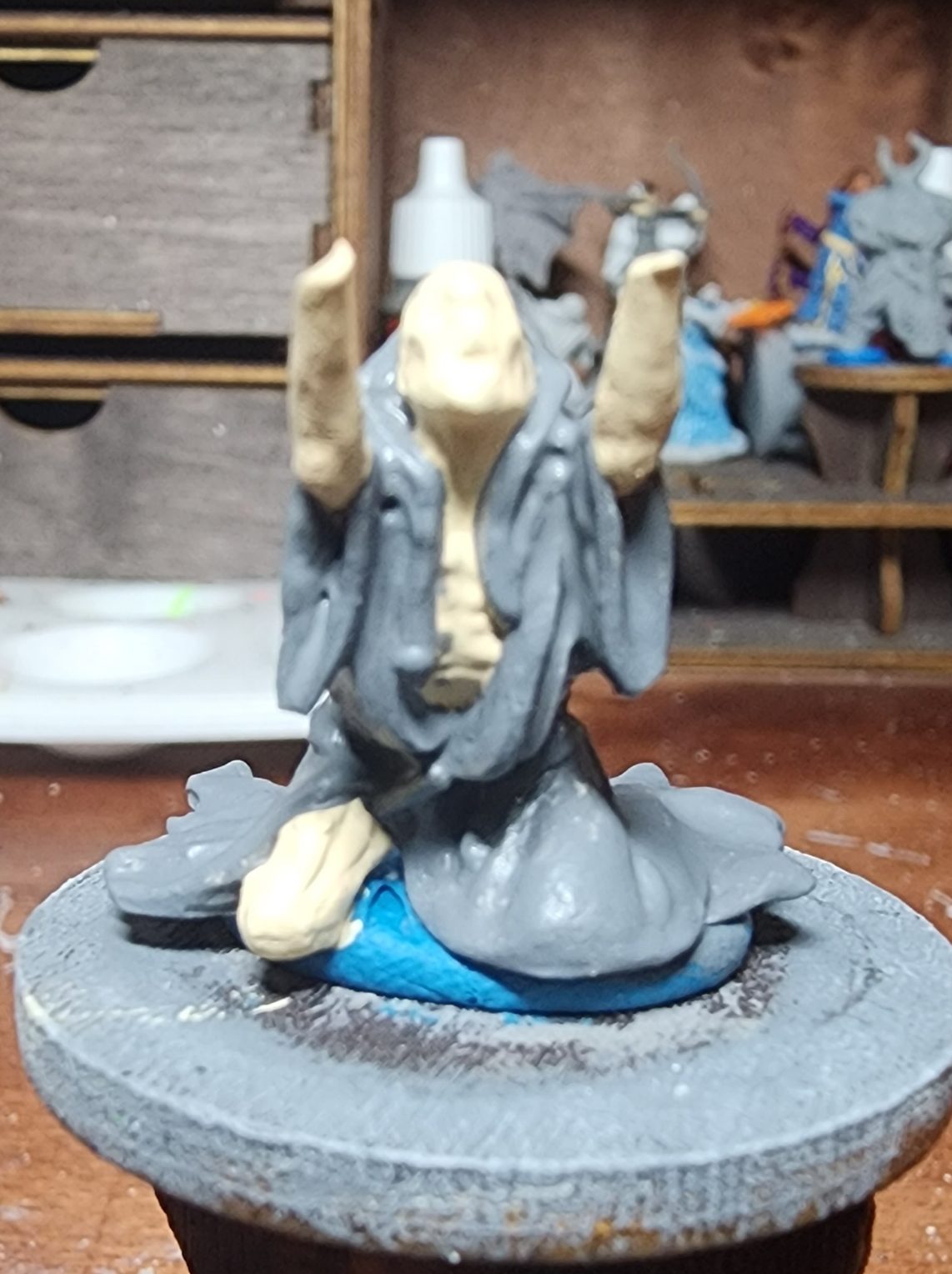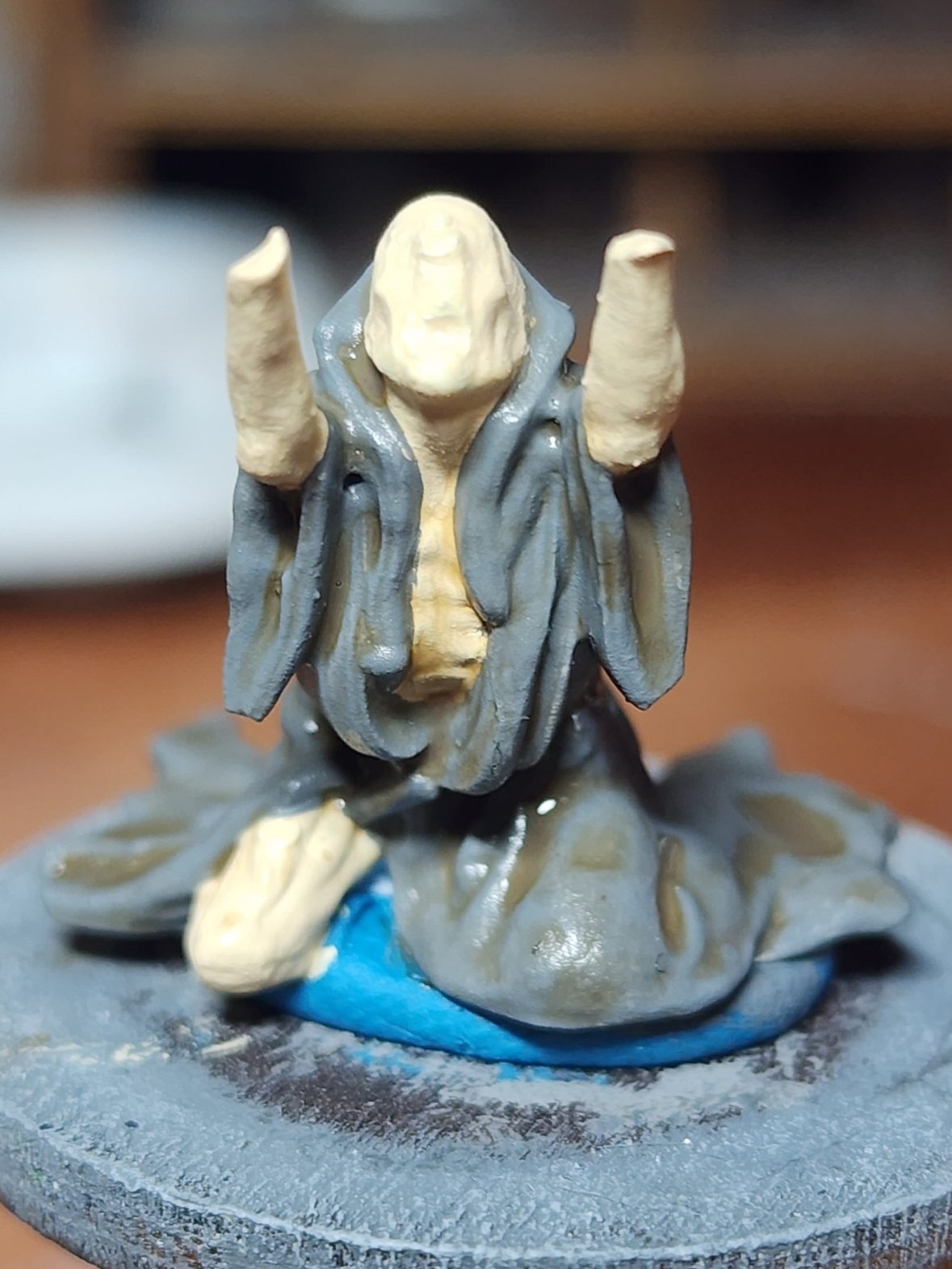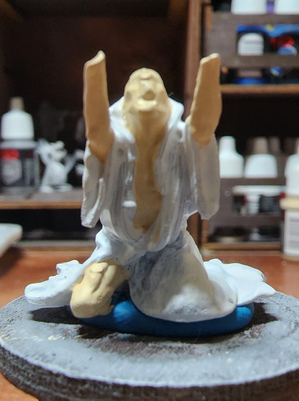 For the next step, I painted the robe a dark, modest gray. I used a couple of layers of gray paint to achieve the necessary opacity. I did have to go in afterwards to clean up the lines where the robe meets the skin. There are always small mistakes in small projects like this piece, but it is reassuring to know you can always go in and correct those mistakes with a bit more paint and a steady hand. It is also important to clean up your lines before you start applying special effects and final details to the miniature.