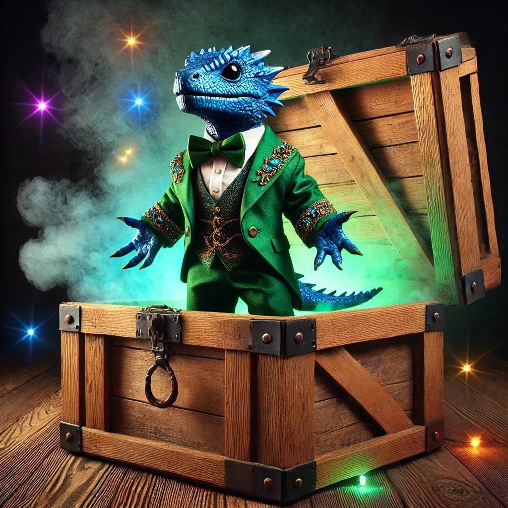 A shadow begins to form from within the smoke and a small, brilliant blue Scalekin steps out of the smoke in a bejeweled, dazzling outfit and begins to play. He is dressed to the nines in an outfit of emerald green to compliment his blue scales and a tiny hat to match sits atop his head just as shining as the outfit. He begins to shriek at the top of his lungs,