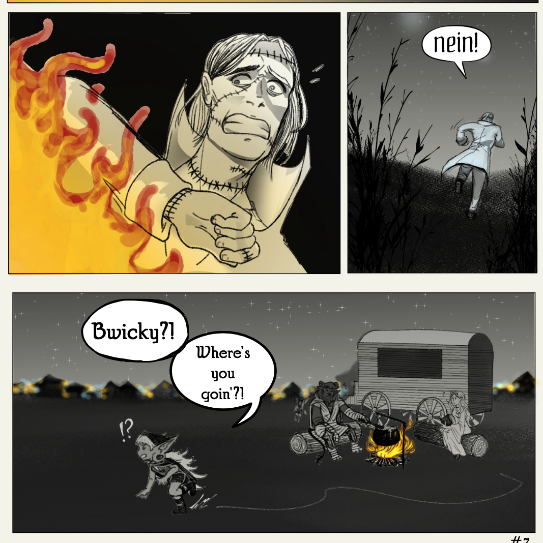 Bricky locked up for a moment. He did not budge an inch closer to the fire. Drexla felt Bricky pull his hand back, out of her hands and looked back to see what had happened. Bricky was already running away from the fire as fast as he could without signs of slowing. He ran past Tobias’ cart, using it as a means to launch himself further forward, and shoving it a good two inches back as he leapt forward.
