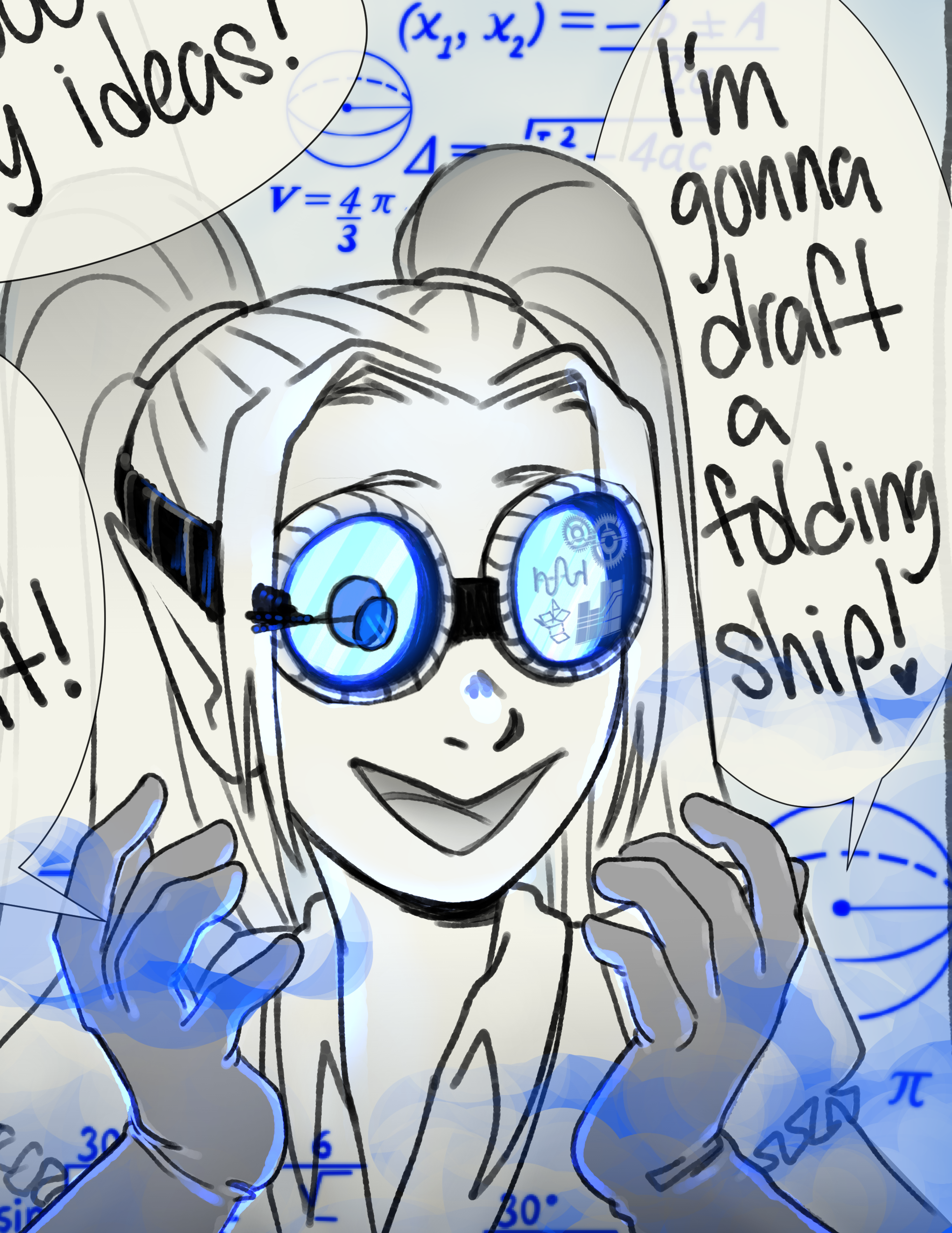 “Well, there is an extensive,” as be began to describe the lengthy process of membership, Drexla pulled out her schematics for the folding ship she had in mind and placed them before him.