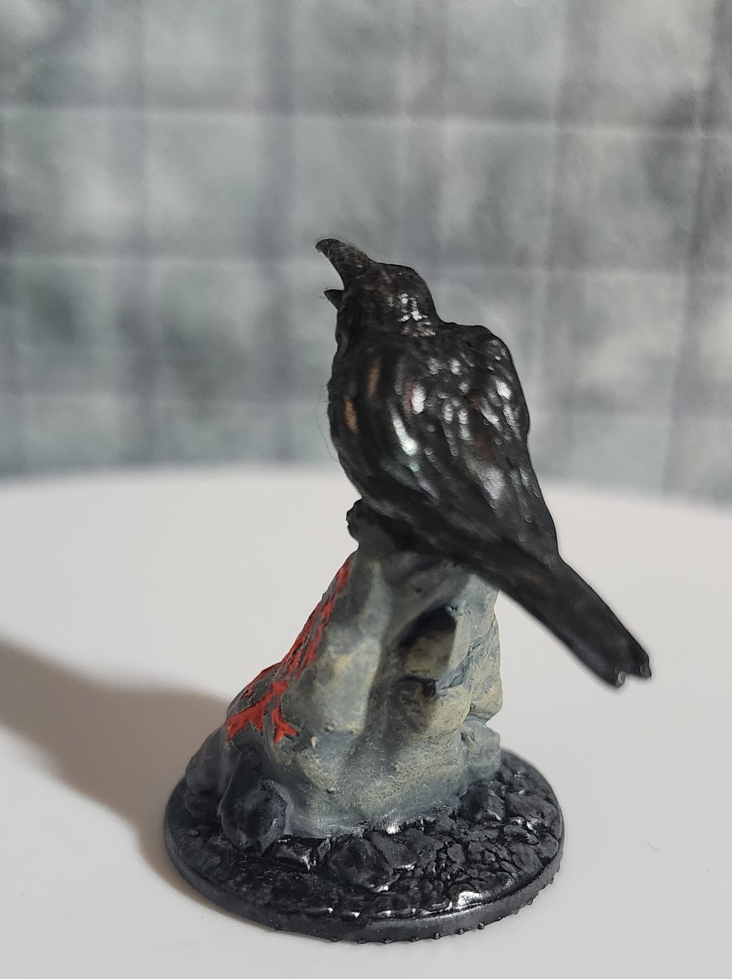 This haunted crow sits on a rune stone waiting for the next adventurer to hear its tale and free it from the curse that has plagued it for so long. At least, that’s my little back story for this miniature set piece. It looks like a very simple miniature but it can serve so many purposes. It could be a magical guide from the gods, or an evil portent. There are so many possibilities, and that’s the goal of painting this pieces. They can be used for various stories and don’t just have one use.