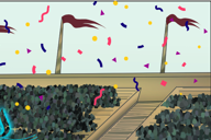 The crowd had been nearly silent the entire time. At times they groaned, like when the smoke obscured the battle for a long time, but mostly they just waited with baited breath. When the battle was over the silence was broken with a lout cheer of triumph as they celebrated a crazy match. It had astounded the gathered crowd and they continued cheering for the next round the begin as their appetite for combat was whetted by the first battle. V and the members of the other team that were still to compete watched as the next team walked up to register for their battle. It was a a group of huge, horned Mir’Ryn. The next team of travelers up to fight worked up their courage for the next battle. They were going to need it.