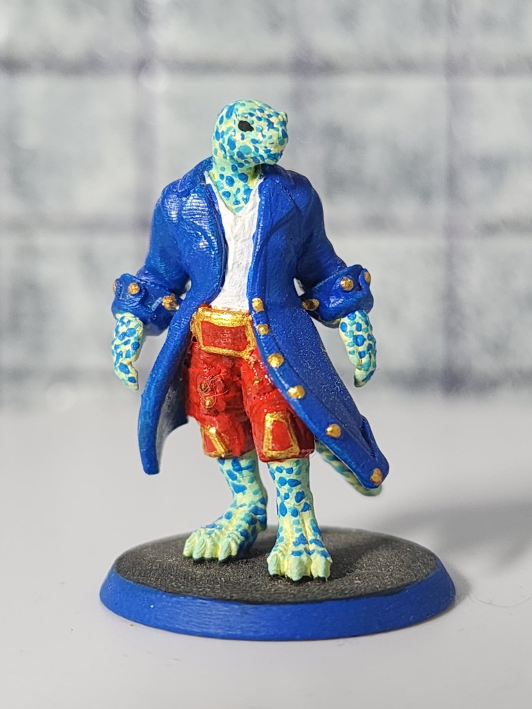 This dapper, young captain has seen many things in his short years. His clean clothes and colorful look belies his dangerous abilities. He is a Scalekin lizard from the Scalekin isles. Not much is known about this far off land of Extrayus but it is brutal. Despite all that V mantains a certain appearance and takes great lengths to look as a captain should at all times. I gave him a simple white shirt underneath his elegant cerulean coat. I added bright scarlet pants and added gold details to denote filigree, and buttons. Because his scales are so colorful, I went with a simple color palette for the clothes.