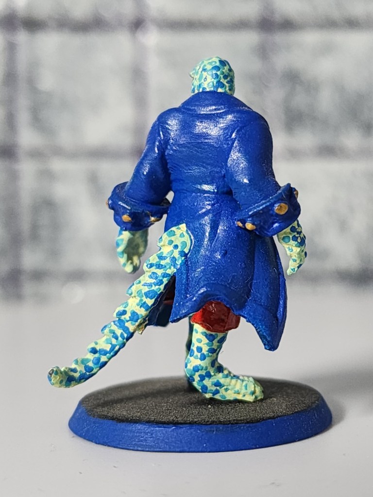 His scales are painted with a light green yellow for the base tone. The blue scales are three different tones all interspersed throughout the mini to give him that mottled look. He looks big here, but the dots were so small it was tough to get them on there without my hand shaking. His colorful scales make him a real hit among the ladies. He makes sure to use that charm as an advantage whenever he can.